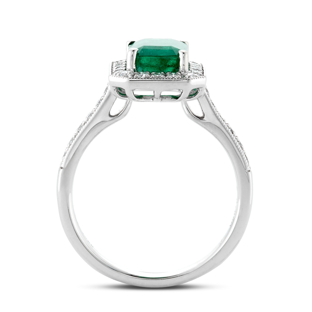 A brand-new, unused, certified natural diamond and emerald cluster ring showcasing timeless elegance and exquisite craftsmanship. At its centre lies a captivating 1.62-carat octagonal step-cut emerald of rich, vibrant green hue, radiating depth and natural brilliance. Surrounding the emerald is a stunning halo of brilliant-cut diamonds that extends gracefully along the shoulders, adding sparkle and sophistication. The diamonds, totalling 0.37 carats, display F–G colour and VS2–SI1 clarity, enhancing the emerald’s vivid tones with exceptional fire and light.