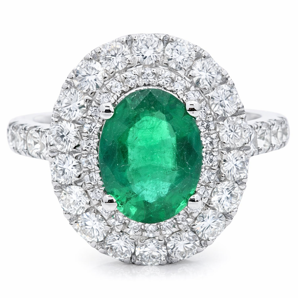 A brand-new, unused, certified natural diamond and emerald oval-shaped cluster ring, set in platinum and centred with a captivating 1.75ct oval-cut emerald of rich, vibrant green. The emerald displays impressive depth of colour and natural character, beautifully proportioned to command attention while retaining refined elegance. Surrounding the centre stone is a striking double halo of brilliant-cut natural diamonds, extending gracefully along the shoulders to create exceptional finger coverage and remarkable presence.