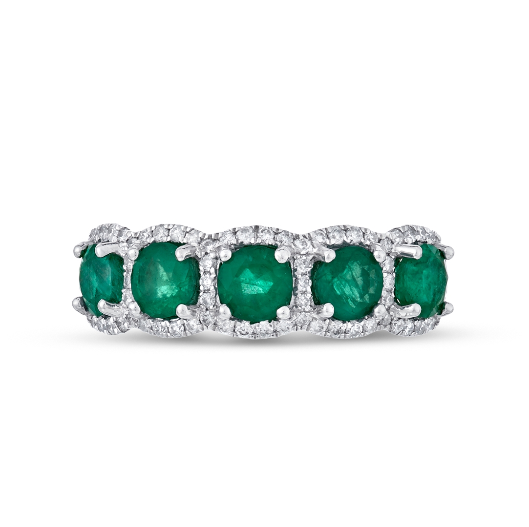 A brand-new, unused certified natural diamond and emerald cluster ring, crafted in platinum and designed to showcase a bold interplay of colour and brilliance. At the centre, five round mixed-cut emerald gemstones form a striking cluster, with a combined weight of approximately 1.80ct, displaying a vivid green tone with strong natural character. Encircling this arrangement is a halo of brilliant-cut natural diamonds, adding a refined layer of sparkle that enhances the overall presence while maintaining a balanced and timeless design.