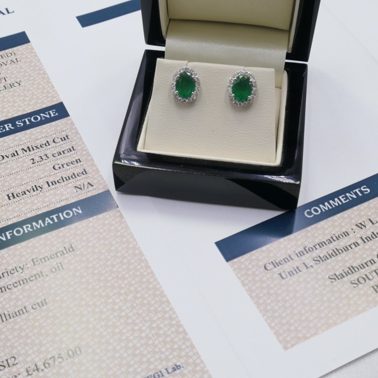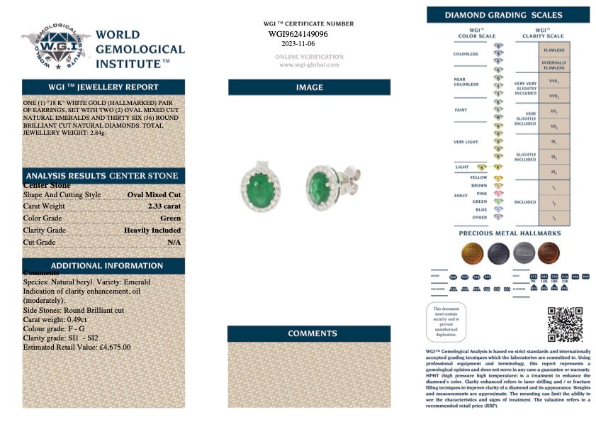 With a total emerald weight of 2.33 carats and a diamond weight of 0.49 carats, these earrings exude luxury and sophistication. The emeralds, with their vivid green hue and heavily included clarity, add a vibrant pop of colour and personality to the design. Complemented by brilliant diamonds, with clarity ranging from SI1 to SI2 and colour from F to G, these earrings sparkle with exceptional radiance and charm.