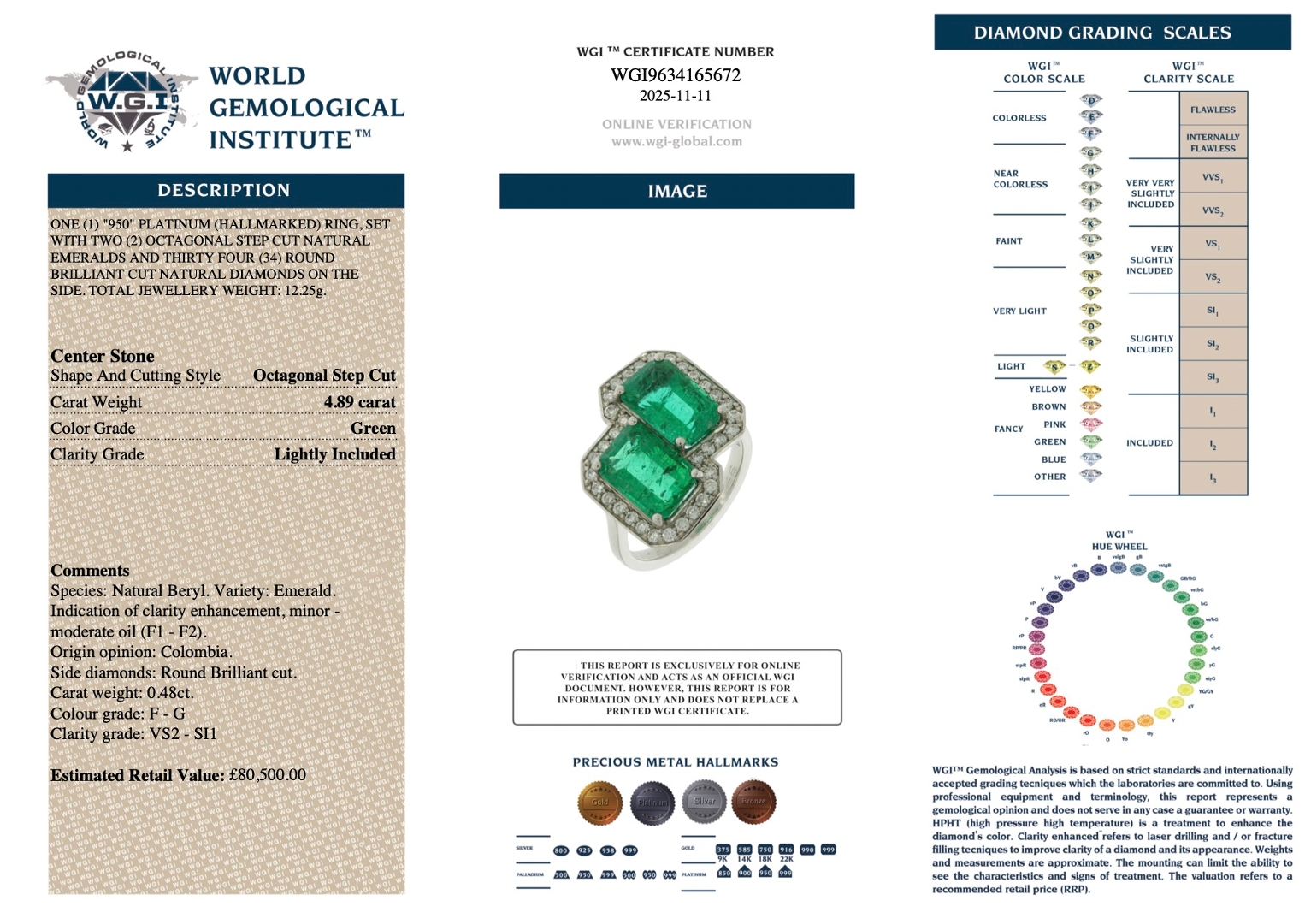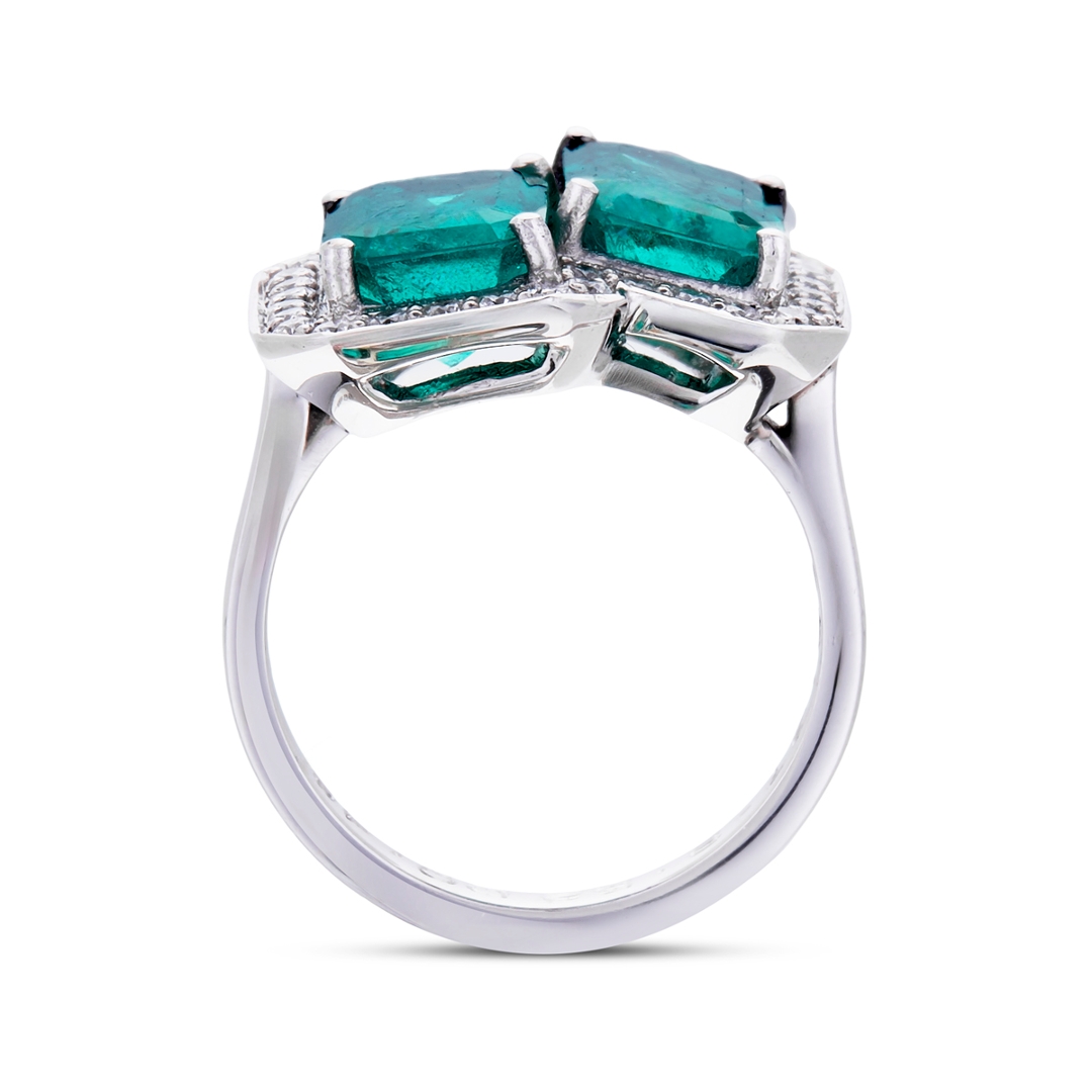 A brand-new, unused certified natural diamond and emerald toi et moi ring that delivers exceptional presence, rich colour and refined craftsmanship in a striking rectangular design. At its centre sit two rectangular mixed-cut emeralds, each weighing 4.89ct, displaying a deep, saturated green tone full of vivid character and natural vibrancy. Their elongated shapes mirror one another beautifully, creating a bold, architectural sweep across the finger while allowing both stones to showcase smooth flashes of colour that shift elegantly with movement. The pairing of two statement emeralds gives the ring an unmistakable sense of luxury and distinction.