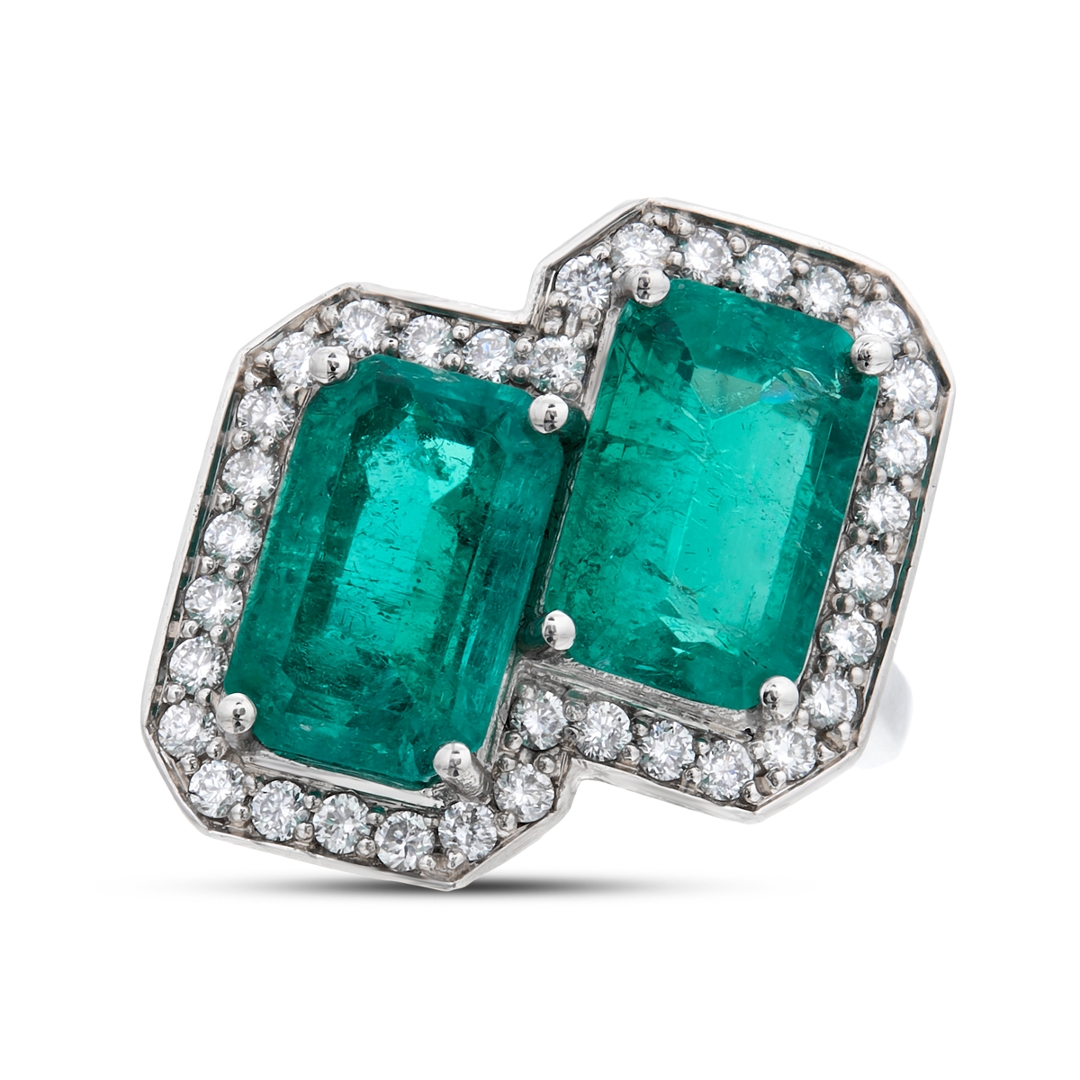 A brand-new, unused, certified natural diamond & emerald toi et moi ring, set with two rectangular mixed cut emerald stones to the centre & a cluster of brilliant cut diamonds in a halo setting, set in platinum.