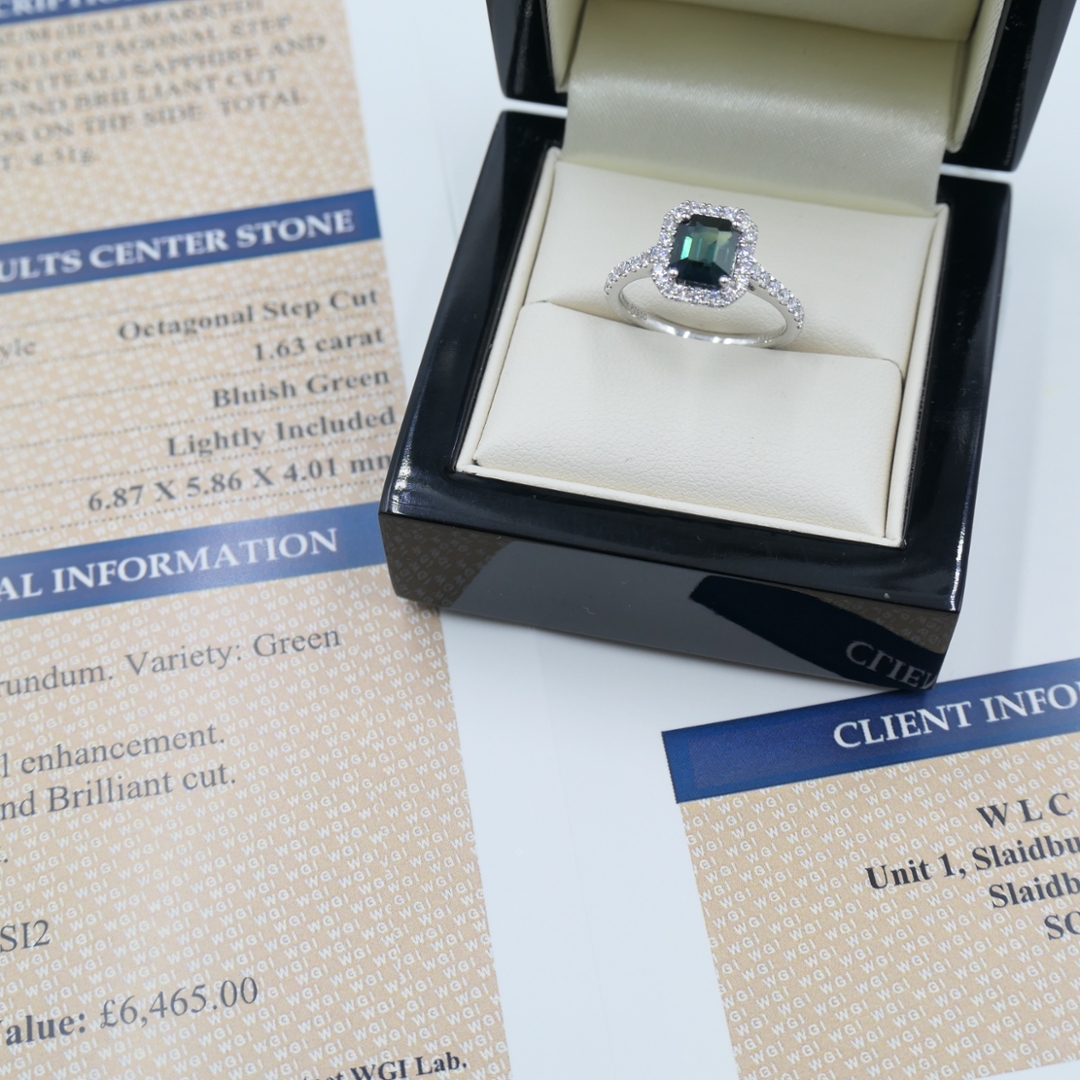 Accompanied by a professional valuation of £6,465, this certified platinum green sapphire and diamond ring represents both sophistication and investment appeal. With natural diamonds admired worldwide for their enduring value and green sapphires prized for their rarity, this piece stands as a captivating expression of elegance, craftsmanship, and long-term value.
