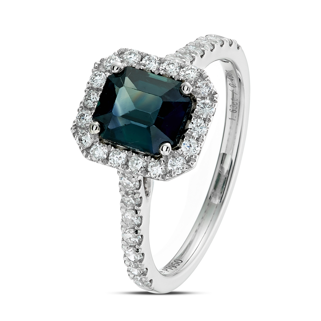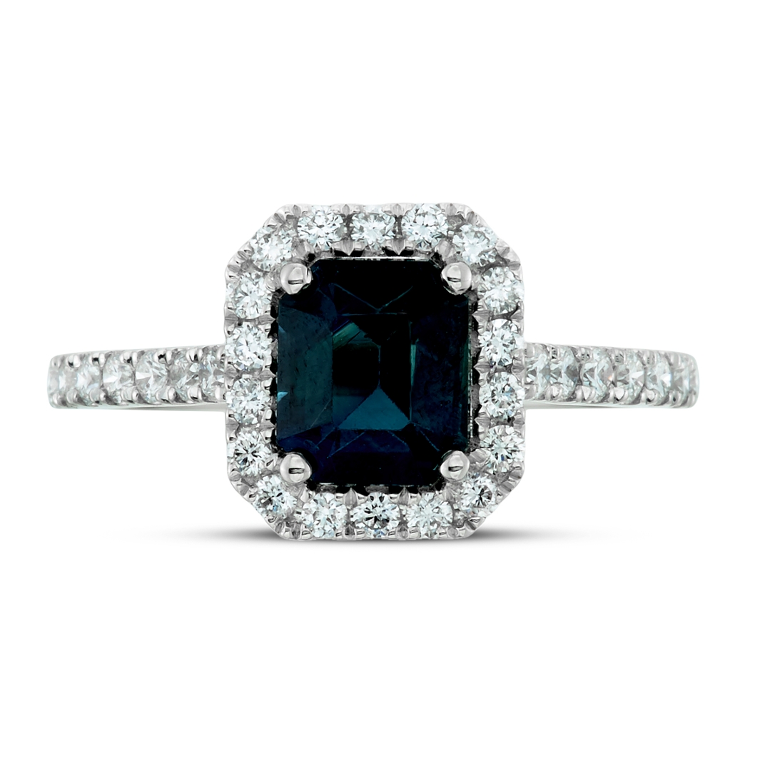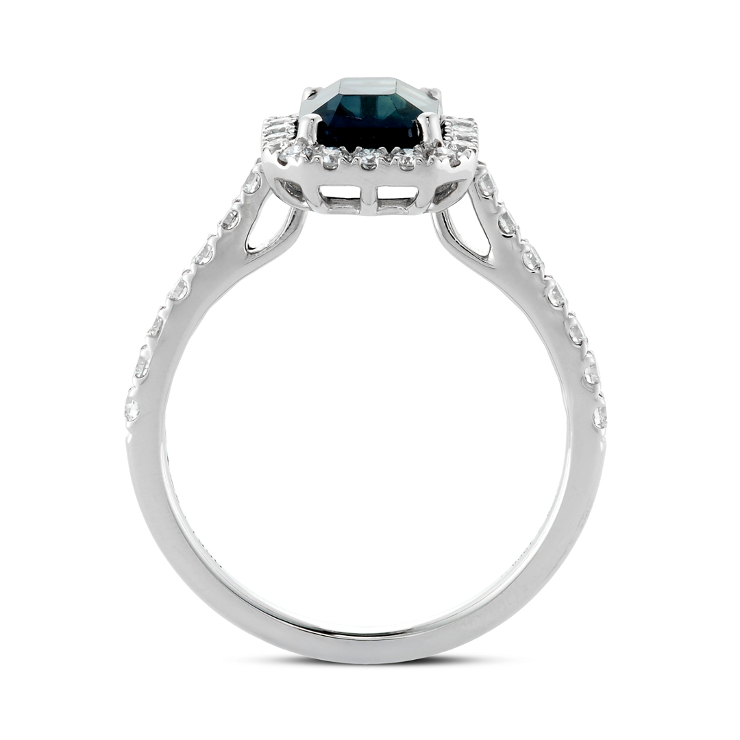 A brand-new, unused certified natural diamond and green sapphire cluster ring that exudes sophistication, rarity, and refined luxury. At its centre lies a 1.63-carat octagonal step-cut green sapphire, displaying an alluring bluish-green hue that shifts beautifully in the light. Surrounding the central gemstone is a halo of brilliant-cut natural diamonds that continue elegantly along the shoulders, creating a radiant, balanced composition. The diamonds, totalling 0.64 carats, are graded G–H in colour and SI1–SI2 in clarity, offering a bright, lively sparkle that perfectly enhances the sapphire’s vivid tone.