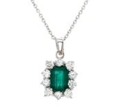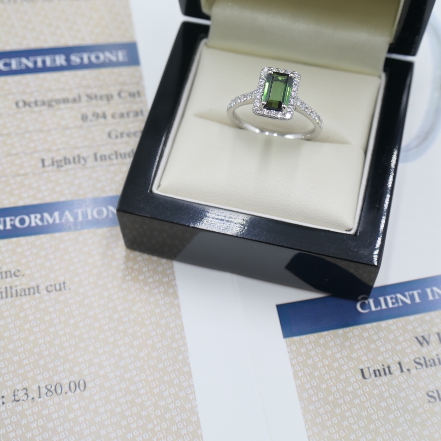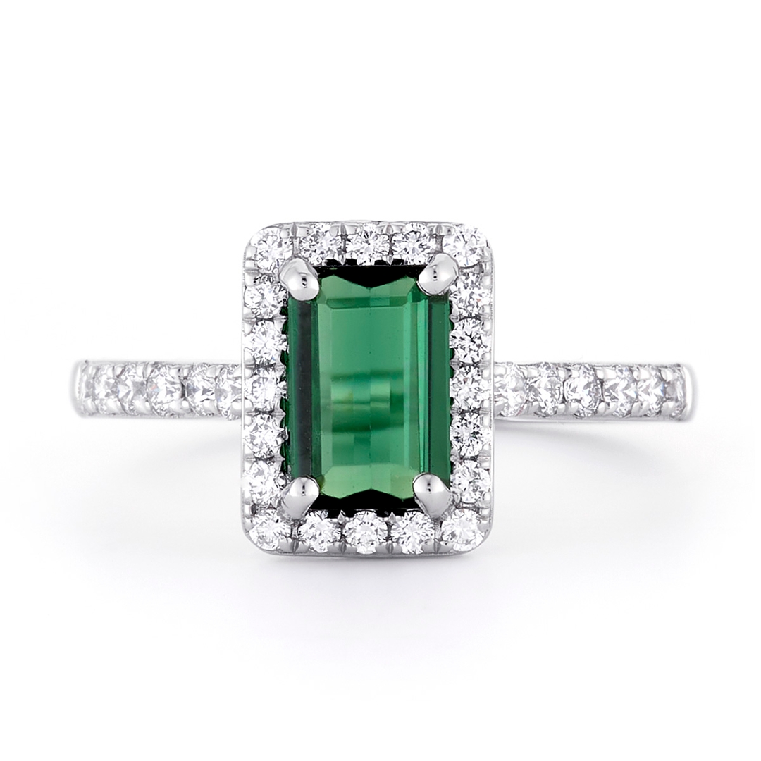 A brand new, unused, certified natural diamond & green tourmaline gemstone baguette-shaped cluster ring, set with one octagonal step-cut green tourmaline gemstone to the centre & a cluster of brilliant cut diamonds in a halo setting & to the shoulders, set in platinum.