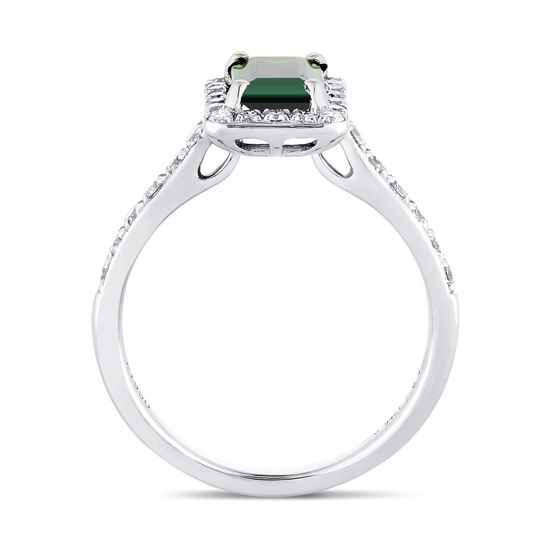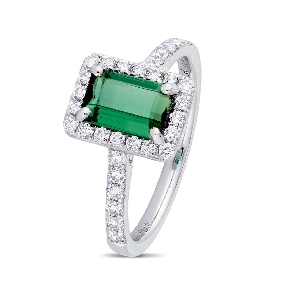 A brand-new, unused, certified platinum, natural-diamond, and green-tourmaline baguette-shaped cluster ring, this elegant piece is a striking fusion of contemporary design and timeless sophistication. At its centre sits a vivid 0.94ct octagonal step-cut green tourmaline, showcasing a rich green hue that symbolises balance, growth, and natural elegance. Framing the gemstone is a dazzling halo of brilliant-cut natural diamonds, with additional diamonds flowing along the shoulders, enhancing the ring’s refined structure and radiant presence.