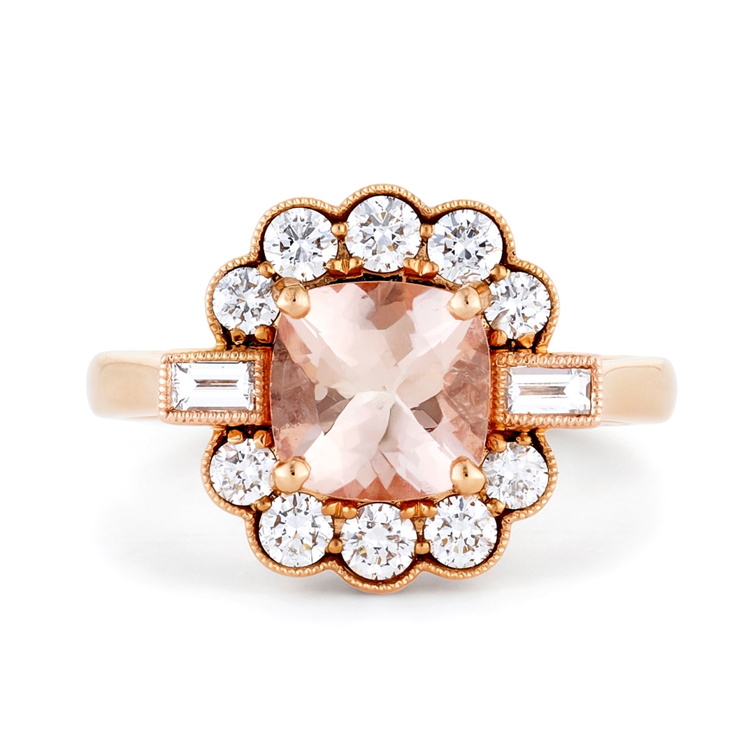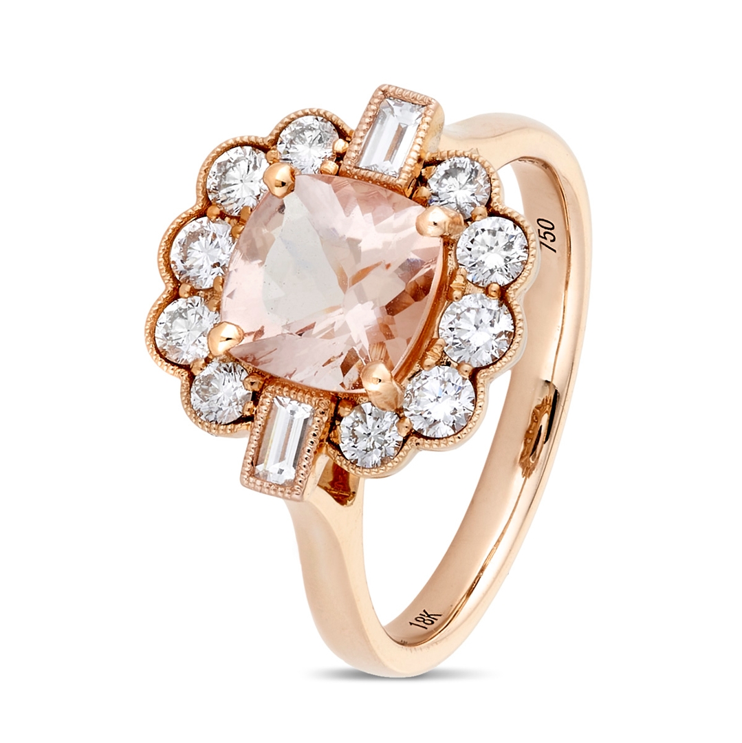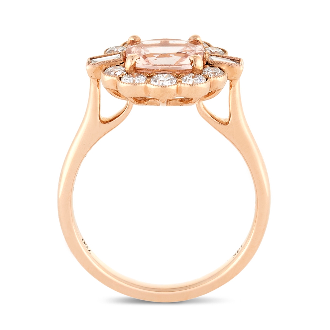 A brand-new, unused, certified natural diamond & morganite gemstone, flower-shaped cluster ring, set with one cushion mixed-cut morganite gemstone at the centre & a cluster of baguette-cut & brilliant-cut diamonds in a halo setting, set in 18ct rose gold.