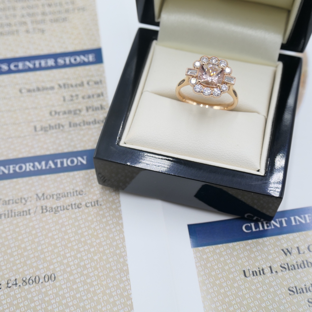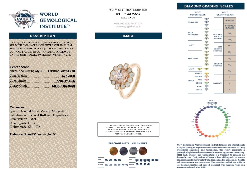 A brand-new, unused, certified 18ct rose gold natural diamond and morganite flower-shaped cluster ring, this captivating piece is a romantic fusion of colour, sparkle, and graceful design. At its heart lies a stunning 1.27ct cushion mixed-cut morganite gemstone, glowing with an enchanting orangy-pink hue that symbolises love, tenderness, and emotional warmth. Surrounding the centre stone is a breathtaking halo of baguette-cut and brilliant-cut natural diamonds, artfully arranged in a floral-inspired cluster that radiates elegance and charm.