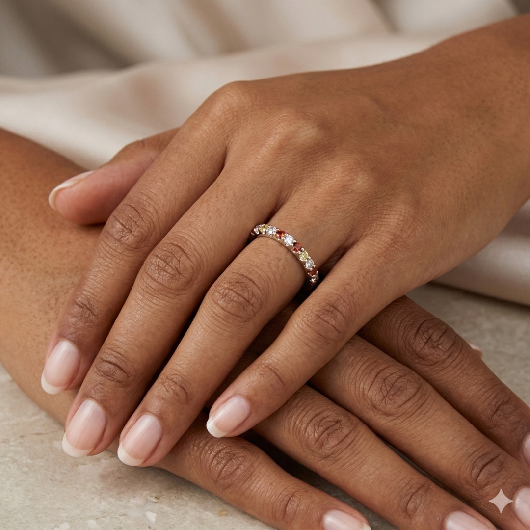 A brand-new, unused certified platinum cluster ring, 3.41 grams, crafted to showcase the vibrant elegance of sapphires alongside the timeless beauty of natural diamonds. Set with a total of 0.30ct of round, mixed-cut, multi-coloured sapphires, each gemstone has been carefully selected for its vivid hue, clarity, and sparkle, creating a lively yet refined display of colour that flows seamlessly around the band. Accompanying the sapphires are 0.08 ct of mixed-cut natural diamonds, graded G-H in colour and VS1-VS2 in clarity. Their crisp, bright brilliance contrasts perfectly with the richness of the sapphires and the enduring superb lustre of platinum, adding both sophistication and charm to the piece.