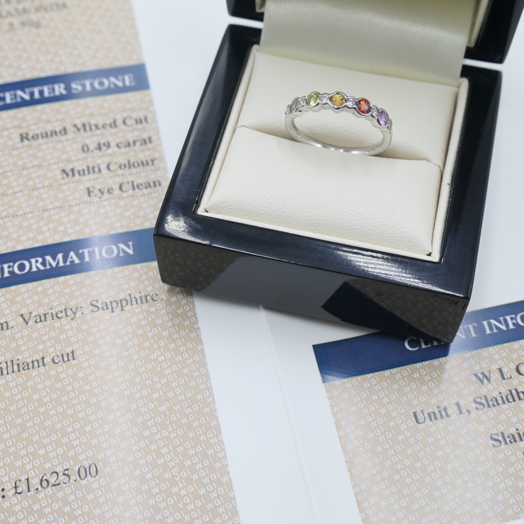A brand-new, unused, certified 18ct white gold natural diamond and multi-coloured sapphire eternity ring, this vibrant piece is a joyful celebration of colour, sparkle, and timeless elegance. Set with a stunning 0.49ct cluster of round mixed-cut sapphires in an array of captivating colours, the ring exudes individuality and charm. Each sapphire brings its personality—ranging from rich blues and fiery oranges to soft pinks and vivid yellows—creating a dazzling rainbow effect that’s both playful and sophisticated.