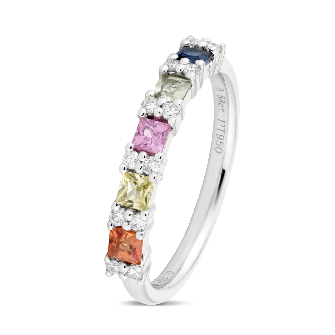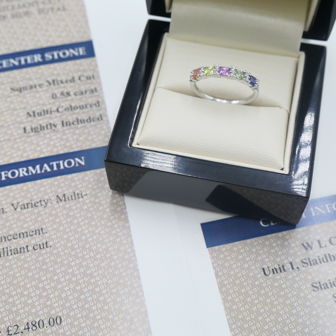 This stunning ring perfectly unites the joyful vibrancy of multicoloured sapphires with the timeless sparkle of natural diamonds — a radiant symbol of elegance, artistry and lasting value.