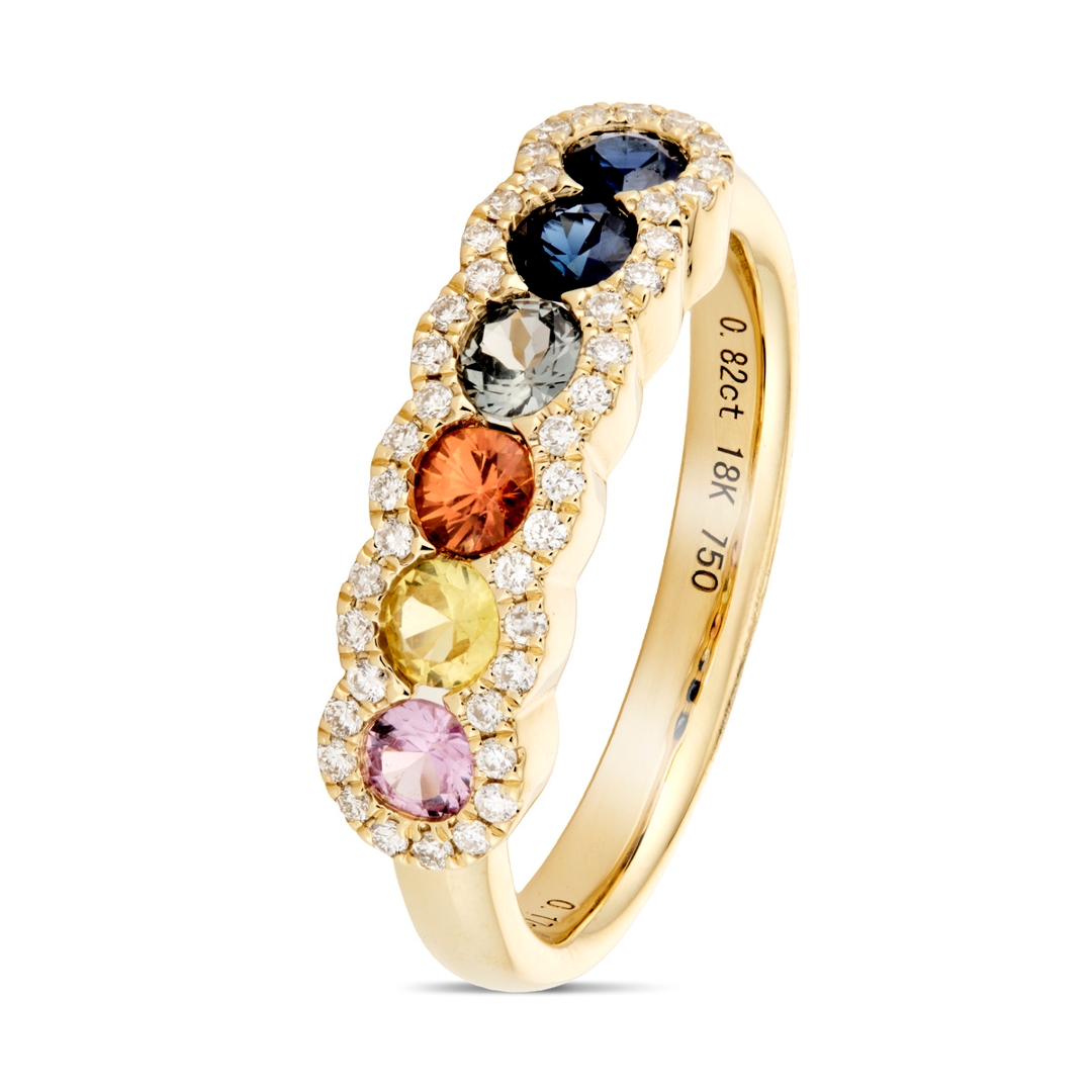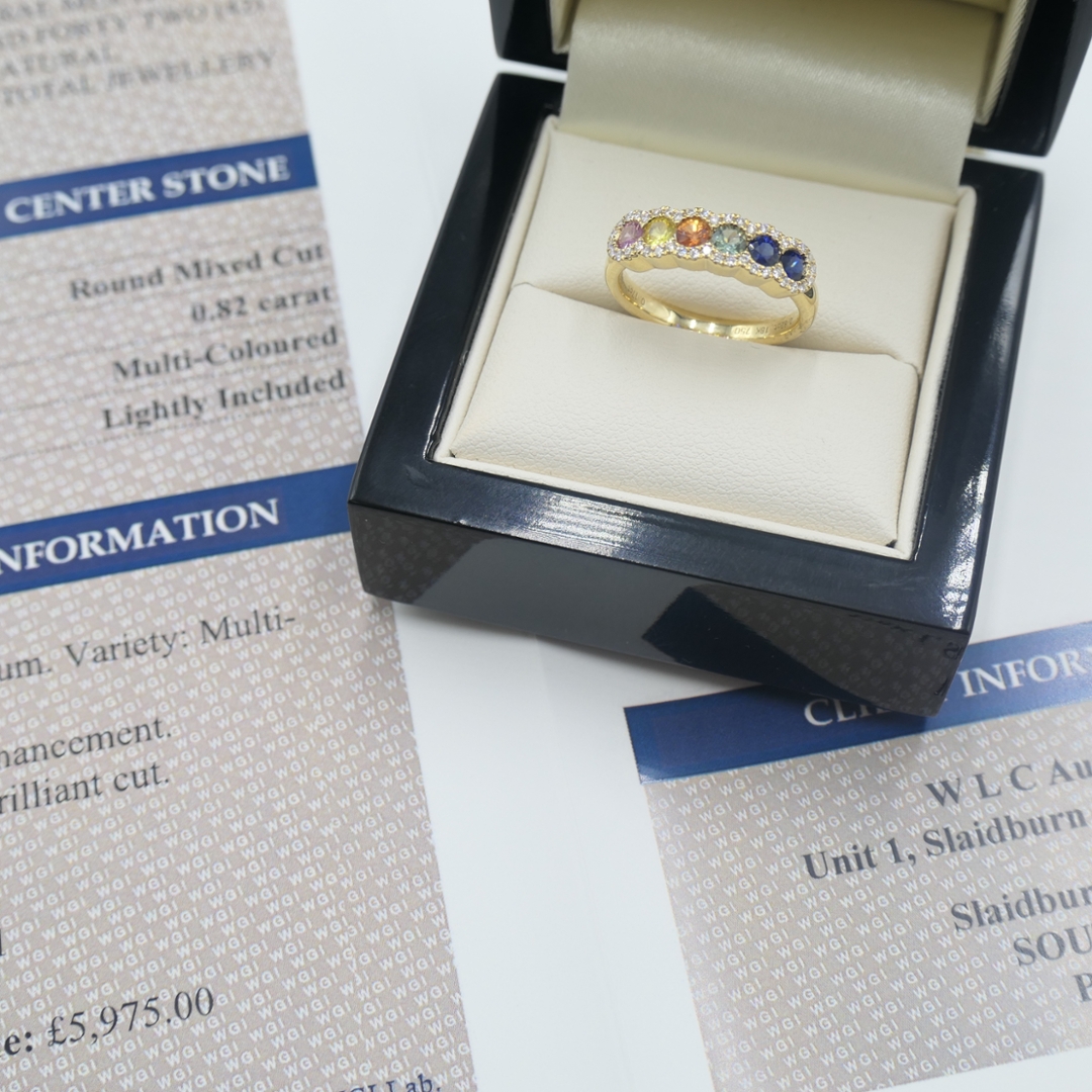 A brand-new, unused certified 18ct yellow gold eternity ring, beautifully designed to showcase the vibrant elegance of sapphires alongside the timeless brilliance of natural diamonds. Set with 0.82ct of round, mixed-cut, multi-coloured sapphires, each stone has been carefully selected for its vivid hue, clarity, and lively sparkle, creating a continuous display of captivating colour around the band. Enhancing the sapphires are 0.17ct of mixed-cut natural diamonds, graded F-G in colour and VS2-SI1 in clarity, whose bright, crisp brilliance contrasts perfectly with the warm glow of the yellow gold setting—weighing 4.82 grams. The combination creates a refined and luxurious piece that will remain a classic for years to come.