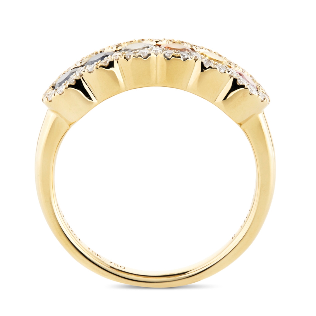 A brand new, unused, certified natural diamond & multi-coloured sapphire gemstone eternity ring, set with a cluster of round mixed cut multi-coloured sapphire gemstones & a cluster of mixed cut diamonds, set in 18ct yellow gold.