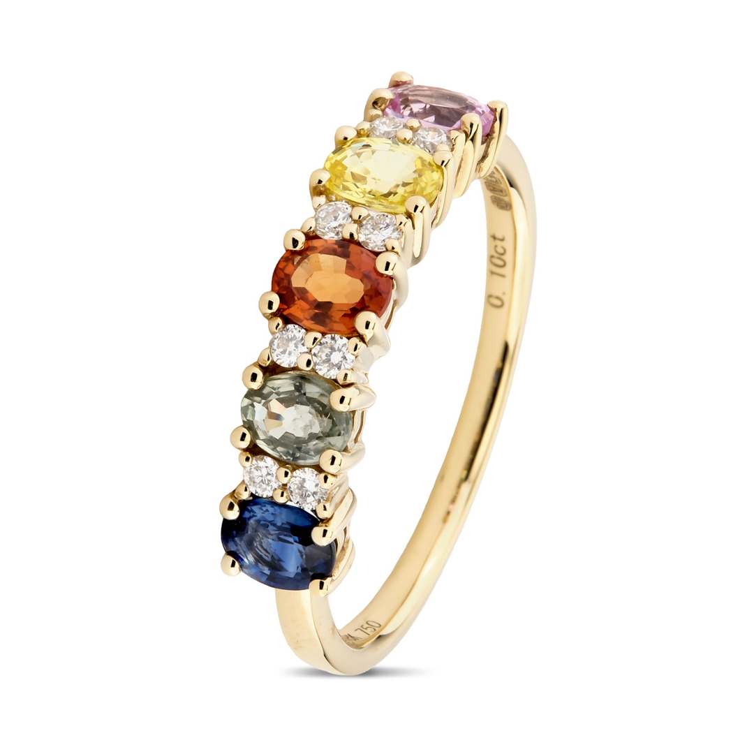 A brand-new, unused, certified 18ct yellow gold eternity ring, beautifully crafted to showcase a continuous arrangement of round, mixed-cut, multi-coloured sapphires, totalling 1.18ct. Each sapphire displays its own vibrant shade, from rich blues to warm pinks and golden yellows, creating a lively spectrum of colour. Interspersed among the sapphires are mixed-cut natural diamonds, totalling 0.10ct, graded F-G in colour and VS2-SI1 in clarity, which add a refined sparkle that enhances the piece's overall elegance. The warm, lustrous tones of the yellow gold setting provide a perfect backdrop, complementing both the brilliance of the diamonds and the depth of the sapphires’ colour.