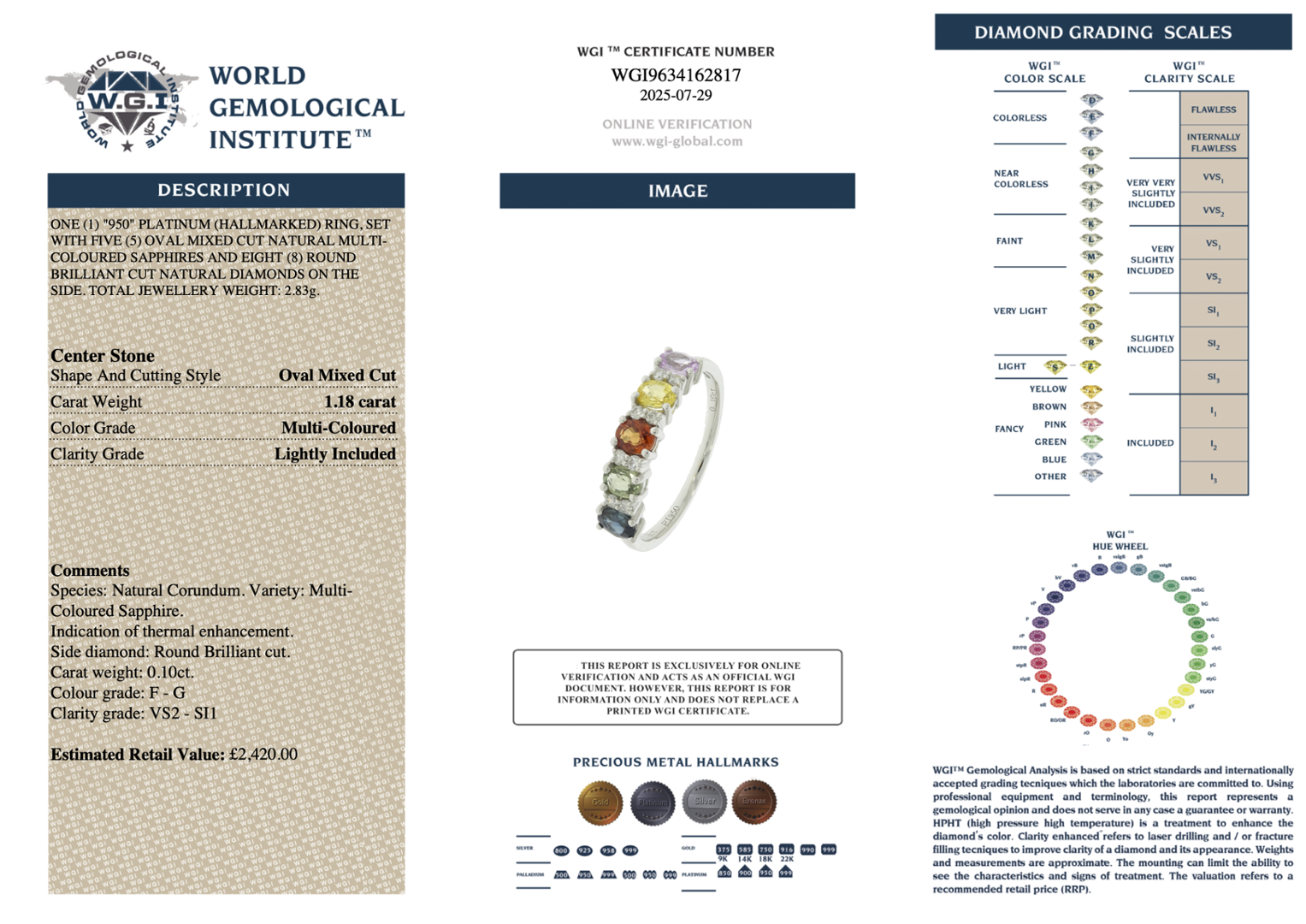 A brand-new, unused certified platinum eternity ring, designed to showcase the vibrant beauty of sapphires alongside the timeless sparkle of natural diamonds. Set with 1.18ct of round, mixed-cut, multi-coloured sapphires, each gemstone has been carefully chosen for its vivid hue, fine clarity, and captivating brilliance, forming a continuous ribbon of colour around the band. Complementing the sapphires are 0.10ct of mixed-cut natural diamonds, graded F-G in colour and VS2-SI1 in clarity, whose bright, crisp radiance stands out perfectly against the incredible, enduring lustre of the platinum, which weighs 2.83 grams. The design achieves a refined balance of elegance, vibrancy and strength.