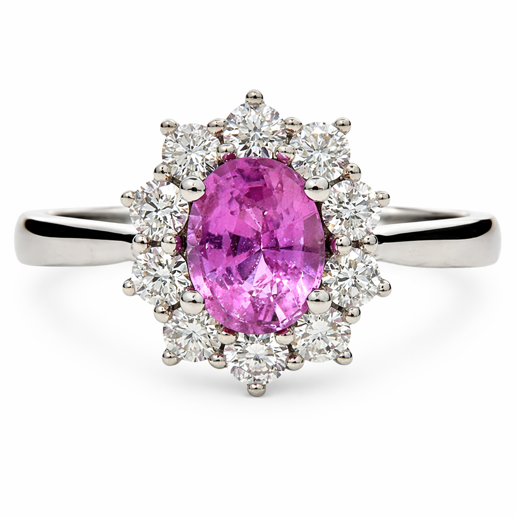 A brand-new, unused certified natural diamond and pink sapphire cluster ring, beautifully crafted in platinum and designed to highlight the delicate contrast between soft colour and radiant brilliance. At the centre of the design sits an elegant oval-cut pink sapphire weighing 1.12ct, displaying a vibrant blush tone that immediately captures attention. The graceful oval cut enhances the gemstone’s natural colour and light reflection, creating a refined focal point that lends the ring a sophisticated, feminine presence within its classic cluster setting.