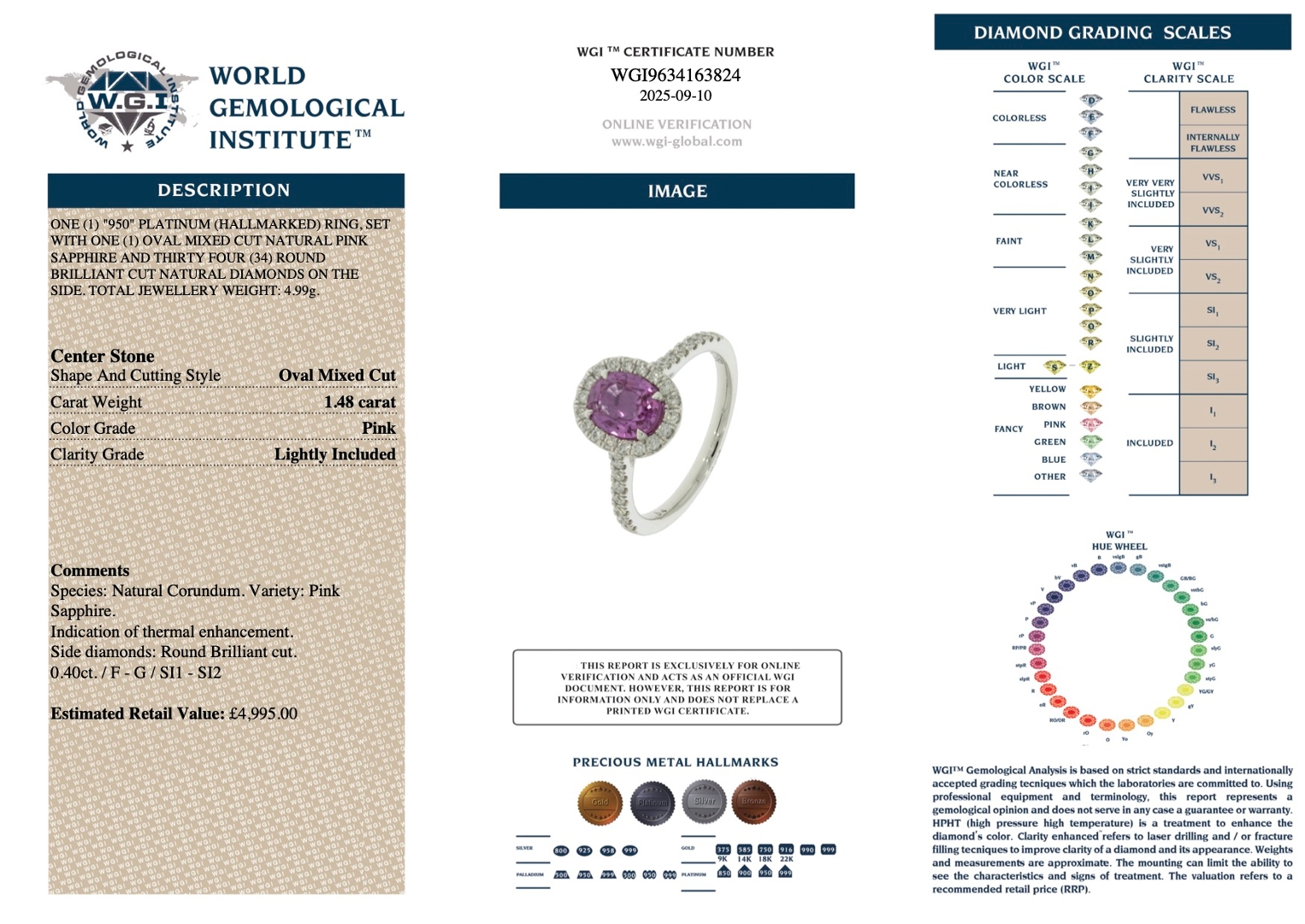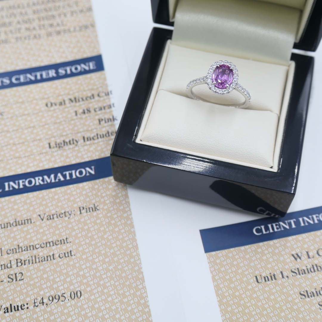 A brand-new, unused certified natural diamond and pink sapphire cluster ring that radiates feminine charm and refined luxury. At its centre lies a captivating 1.48ct oval mixed-cut pink sapphire, displaying a vivid pink hue that exudes warmth and romance. Surrounding this beautiful gemstone is a halo of brilliant-cut natural diamonds that gracefully extend along the shoulders for added sparkle. The diamonds, weighing a total of 0.40ct, are graded F–G in colour and SI1–SI2 in clarity, ensuring a bright, lively brilliance that enhances the sapphire’s vibrant tone. Expertly crafted in platinum, the ring offers strength, durability and a lustrous finish, with a total weight of 4.99 grams and a professional valuation of £4,995.