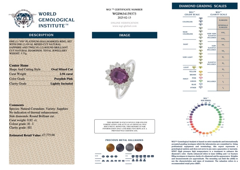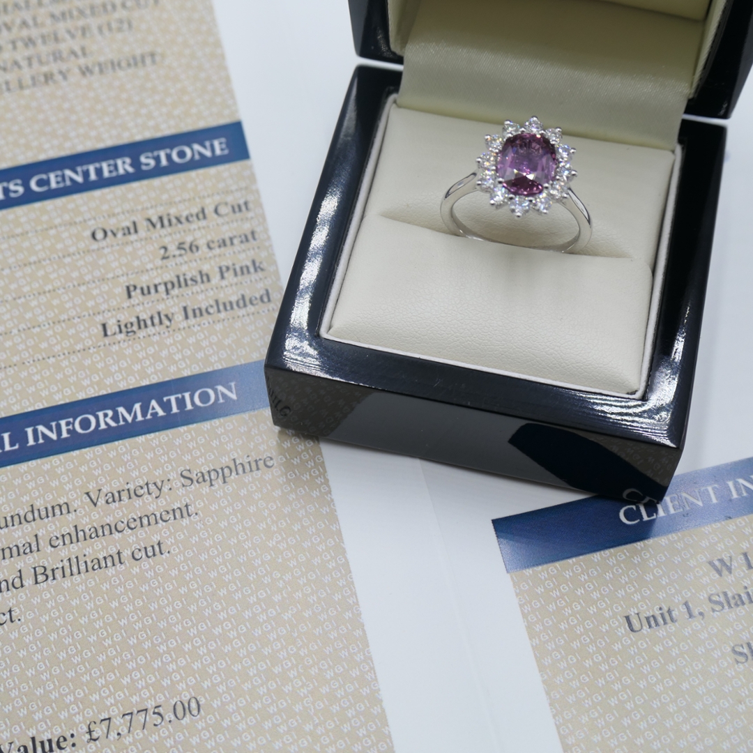 A brand-new, unused certified natural diamond and pink sapphire gemstone cluster ring that radiates sophistication and charm. Beautifully crafted in platinum, this exquisite piece features a captivating oval mixed-cut pink sapphire weighing 2.56 carats, displaying an alluring purplish-pink hue that embodies romance and elegance. Surrounding the sapphire is a dazzling halo of brilliant-cut natural diamonds, meticulously set to enhance its vibrant colour and brilliance. The diamonds, totalling 0.82 carats and graded H–I in colour with SI1 clarity, create a mesmerising contrast against the vivid centre stone, illuminating the design with breathtaking sparkle.
