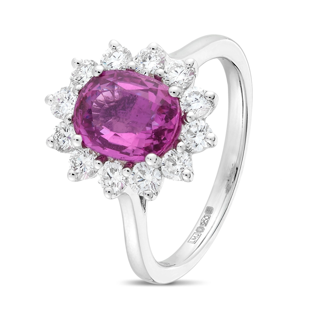 A brand-new, unused, certified natural diamond & pink sapphire gemstone cluster ring, set with one oval mixed-cut pink sapphire gemstone to the centre & a cluster of brilliant-cut diamonds in a halo setting, set in platinum.