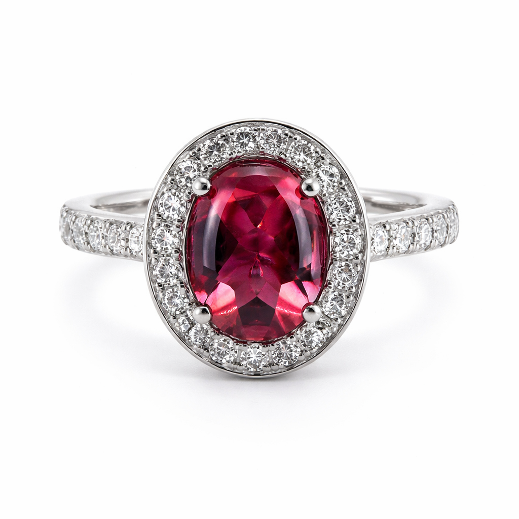 A brand-new, unused, certified natural diamond and pink tourmaline oval-shaped cluster ring, set with one oval-cut pink tourmaline at the centre, surrounded by a halo of brilliant-cut diamonds and further diamond accents to the shoulders, all crafted in platinum. The central 1.66ct tourmaline displays a vibrant pink tone, offering a striking focal point, while the surrounding diamonds create a luminous frame that enhances both colour and overall presence on the hand.