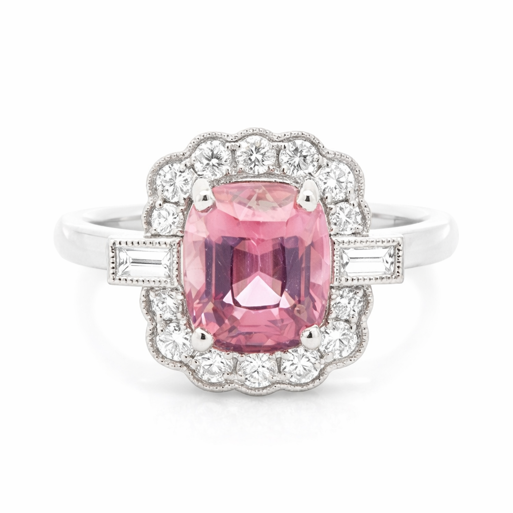 A brand-new, unused certified natural diamond and pink tourmaline flower-shaped cluster ring that combines vibrant colour, refined sparkle, and the lasting qualities of genuine gemstones. At the centre rests a 2.19ct cushion-cut pink tourmaline with a lively, uplifting hue that gives the ring a warm and striking presence, its soft facets catching the light with clarity. Framing the centre stone are two baguette-cut natural diamonds that introduce clean structure and guide the eye toward a halo of natural brilliant-cut diamonds arranged in a floral design. With a total diamond weight of 0.40ct, these natural diamonds bring crisp brightness and carry the strong appreciation factor long associated with genuine mined stones, valued for their authenticity, rarity, and continued desirability in fine jewellery.