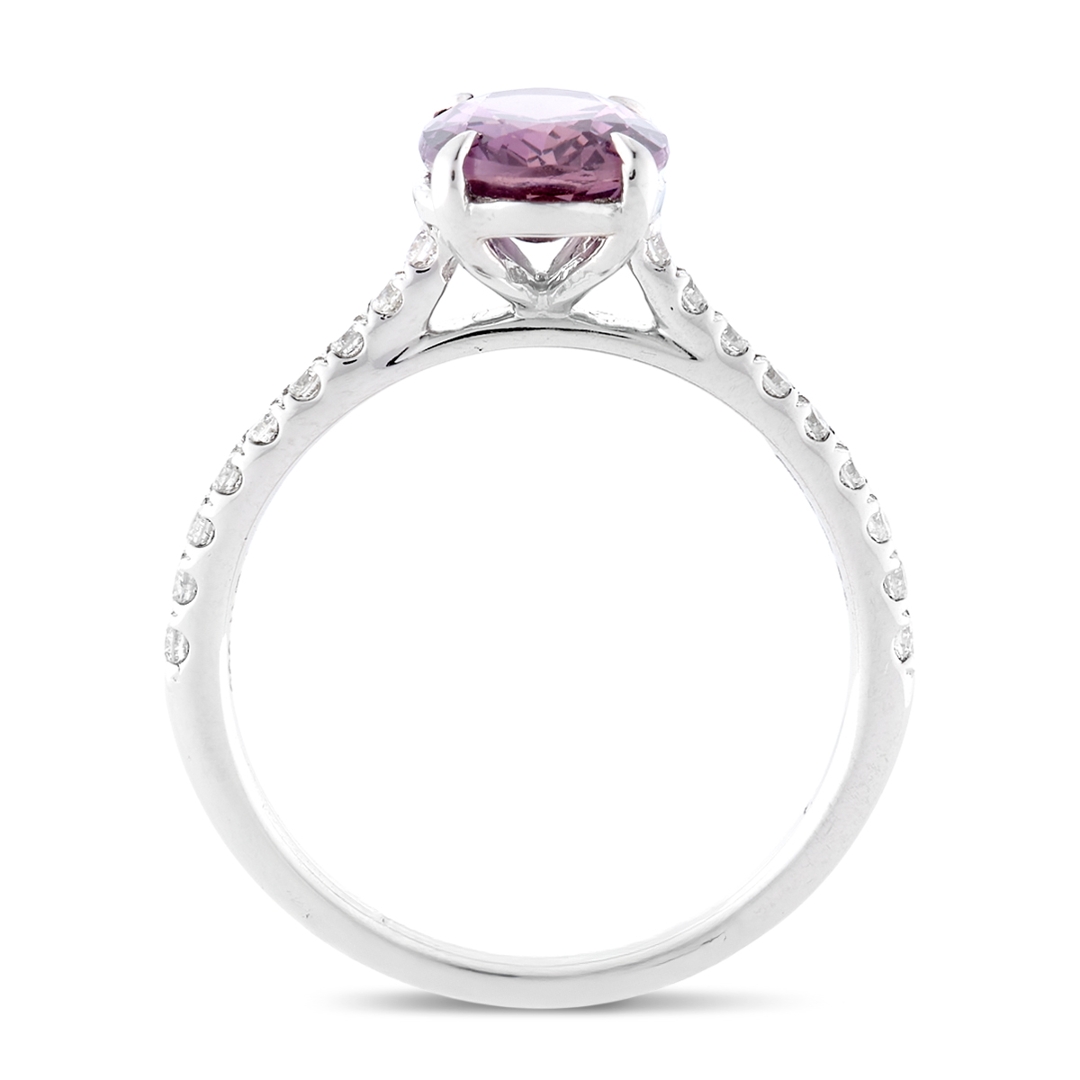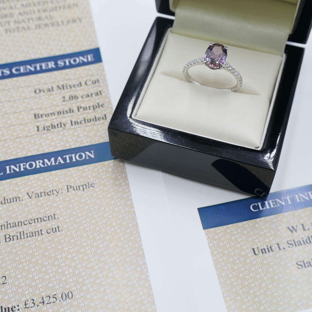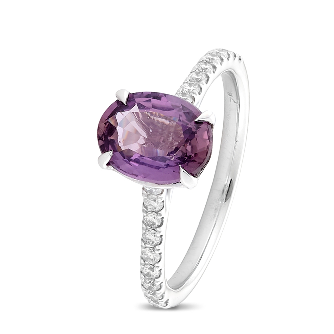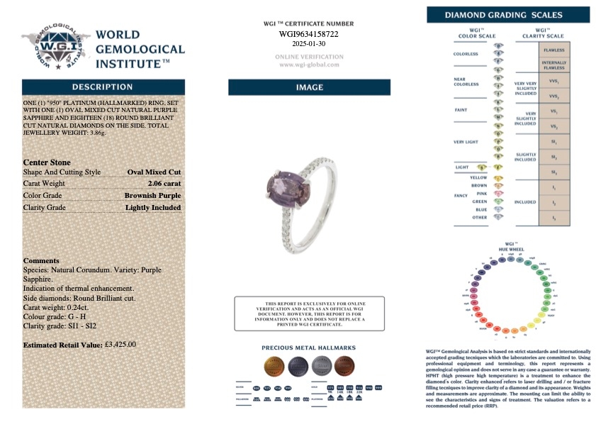 A brand-new, unused, certified natural diamond and purple sapphire oval-cut cluster ring that radiates elegance and individuality. Crafted in platinum, this captivating piece features a stunning 2.06-carat oval mixed-cut purple sapphire at its heart, displaying enchanting brownish-purple tones that shimmer with depth and sophistication. The central gemstone is beautifully complemented by a cluster of brilliant-cut natural diamonds adorning the shoulders, totalling 0.24 carats, with G–H colour and SI1–SI2 clarity. Together, sapphire and diamond create a mesmerising contrast — the warmth of the sapphire perfectly balanced by the crisp brilliance of the diamonds.
