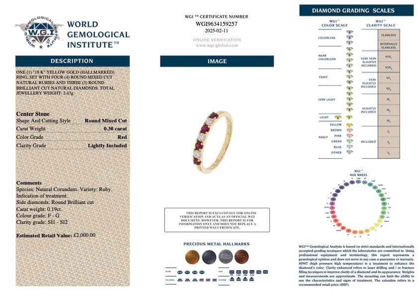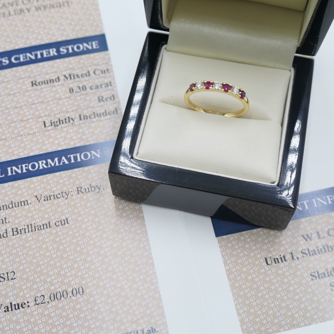 A brand-new, unused, certified 18ct yellow gold natural diamond and ruby gemstone eternity ring that beautifully combines passion, colour, and timeless design. Crafted with exceptional precision, this elegant ring features four round, mixed-cut rubies totalling 0.30 carats, whose rich red hue symbolises love, vitality, and strength. Interspersed between the rubies are three brilliant-cut natural diamonds weighing 0.19 carats, graded F–G in colour and SI1–SI2 in clarity. The combination of fiery rubies and radiant diamonds creates a captivating display of light and contrast, offering a perfect balance between vibrancy and sophistication.