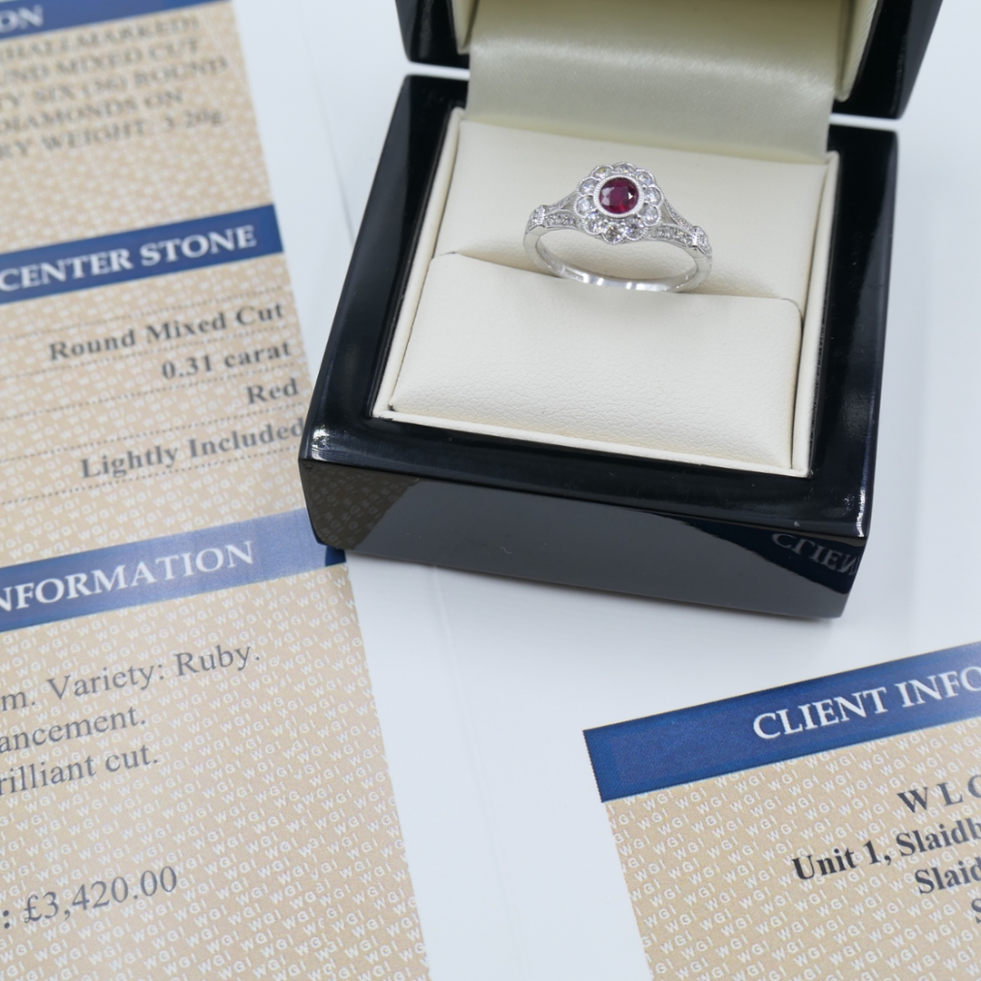 With a professional valuation of £3,420, this certified 18ct white gold ruby and diamond cluster ring offers both lasting beauty and investment value. Natural diamonds remain a universally admired symbol of prestige and enduring worth, making this piece an exquisite and collectable addition to any fine jewellery collection.