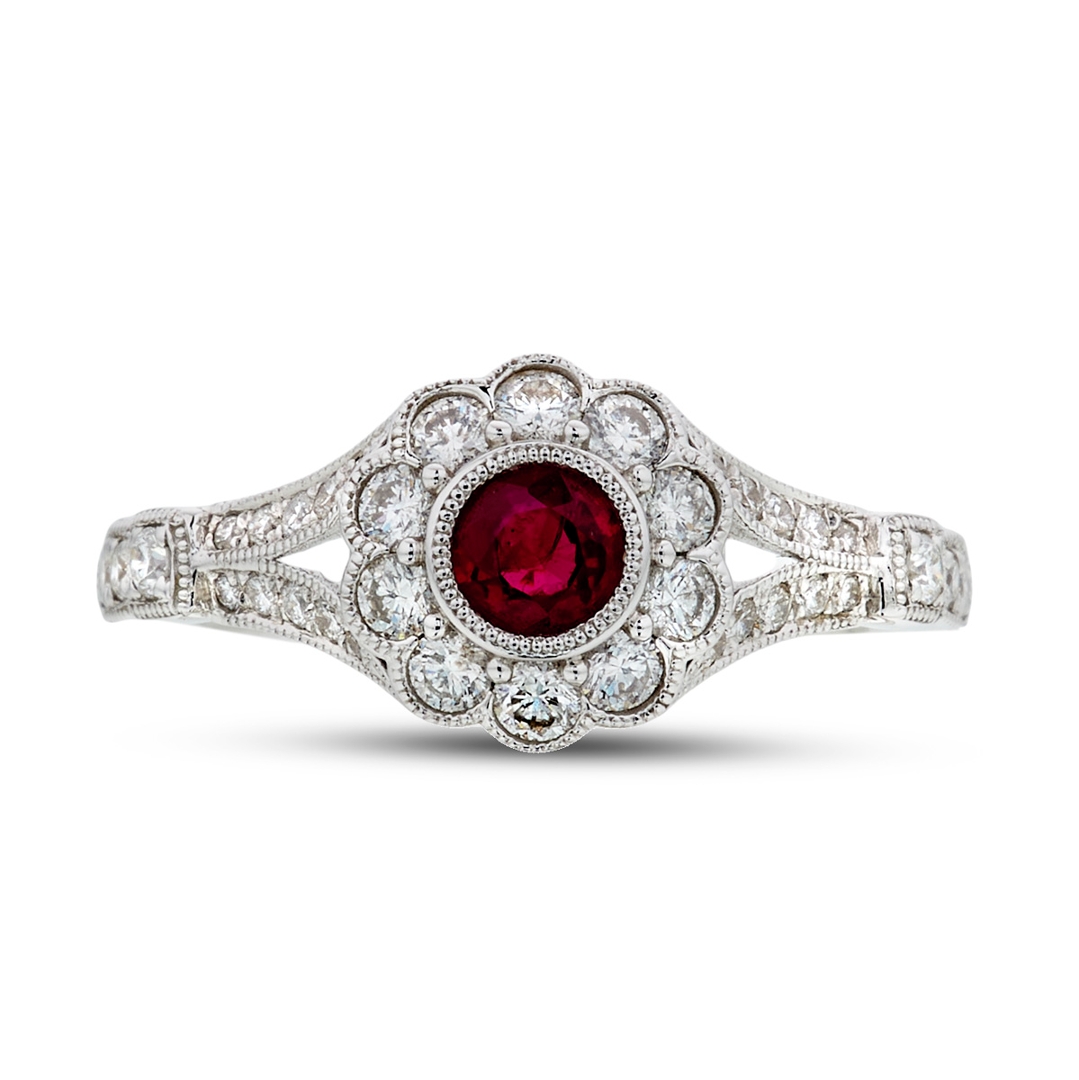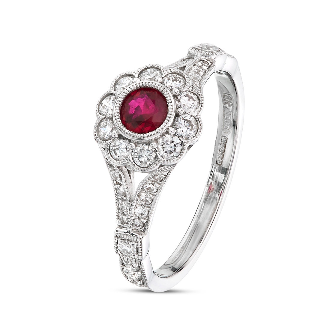 A brand-new, unused, certified natural diamond & ruby flower-shaped cluster ring, with one round mixed-cut ruby gemstone at the centre & a cluster of brilliant-cut diamonds in a halo setting & on the shoulders, set in 18ct white gold.