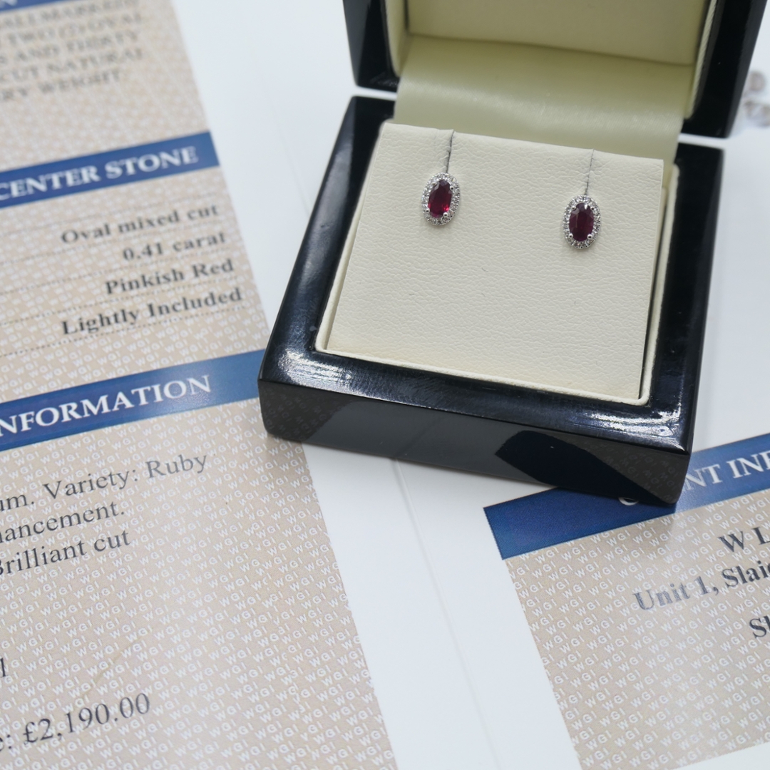A brand-new, unused, certified pair of 18ct white gold, natural diamond, and ruby gemstone oval-shaped cluster earrings. These refined and romantic pieces combine timeless elegance with captivating colour. Each earring features a beautifully cut oval ruby at the centre, totalling 0.41ct across the pair. The rubies display a vivid pinkish-red hue, full of warmth and intensity, symbolising passion, love, and enduring style.