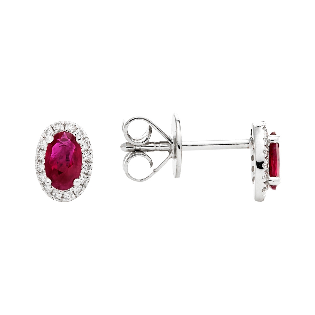 A brand-new, unused, certified pair of natural diamond & ruby oval-shaped cluster earrings, set with two oval mixed-cut ruby gemstones at the centre & a cluster of brilliant-cut diamonds in a halo setting, set in 18ct white gold.