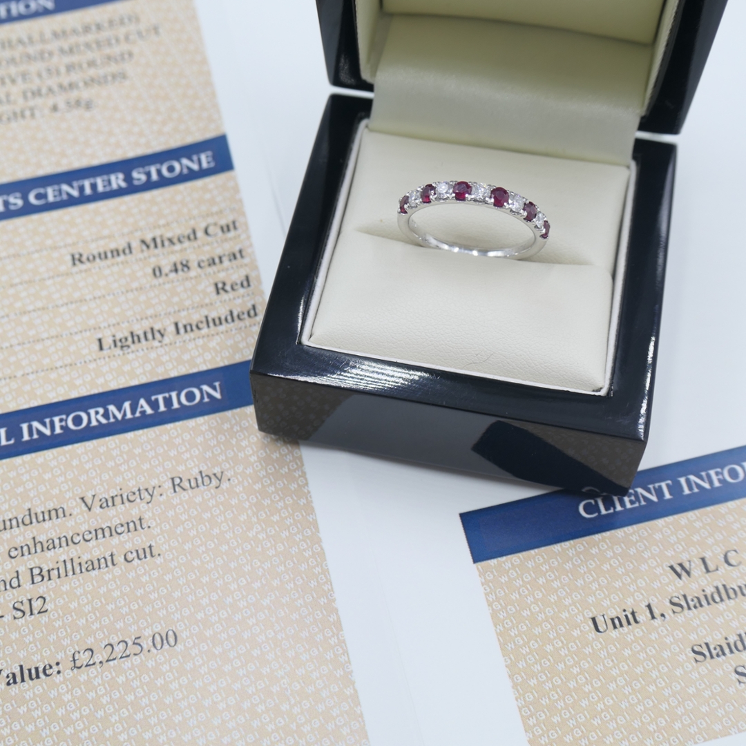 A brand new, unused, certified natural diamond & ruby gemstone eternity ring, set with six round mixed-cut ruby gemstones & five brilliant-cut diamonds, set in platinum.