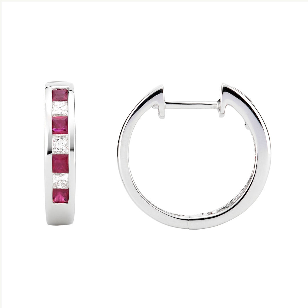 A brand new, unused certified pair of natural diamond & ruby gemstone hooped earrings, set with eight square mixed cut ruby gemstones & six brilliant cut diamonds, set in 18ct white gold.