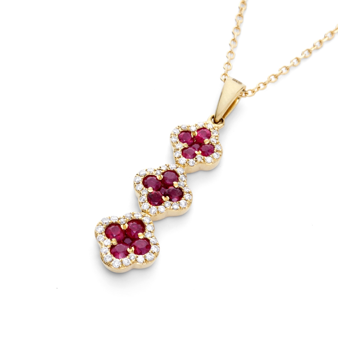 - > Natural Ruby 0.54ct & Diamond 0.14ct Clover Shaped Droplet Cluster Pendant
