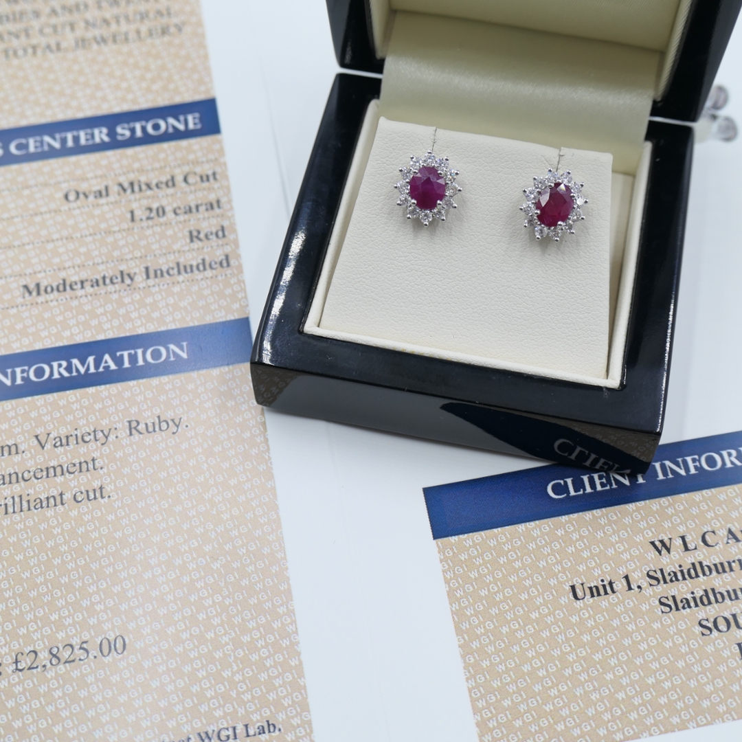 A brand-new, unused certified pair of natural diamond and ruby gemstone cluster earrings, elegantly crafted in 18ct white gold. Each earring features a radiant oval mixed-cut ruby, together weighing 1.20 carats, displaying a rich red hue that symbolises passion and sophistication. Surrounding each ruby is a dazzling cluster of brilliant-cut natural diamonds, totalling 0.51 carats, with G-H colour and SI1–SI2 clarity. The luminous white gold setting enhances both the fiery depth of the rubies and the crisp brilliance of the diamonds, creating a refined and timeless design that embodies grace and luxury.