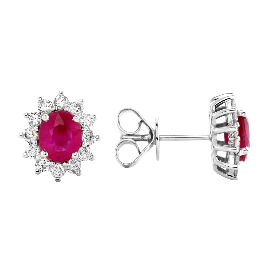 A brand-new, unused, certified pair of natural diamond & ruby gemstone cluster earrings, with two oval-mixed cut ruby gemstones & a cluster of brilliant cut diamonds, set in 18ct white gold.