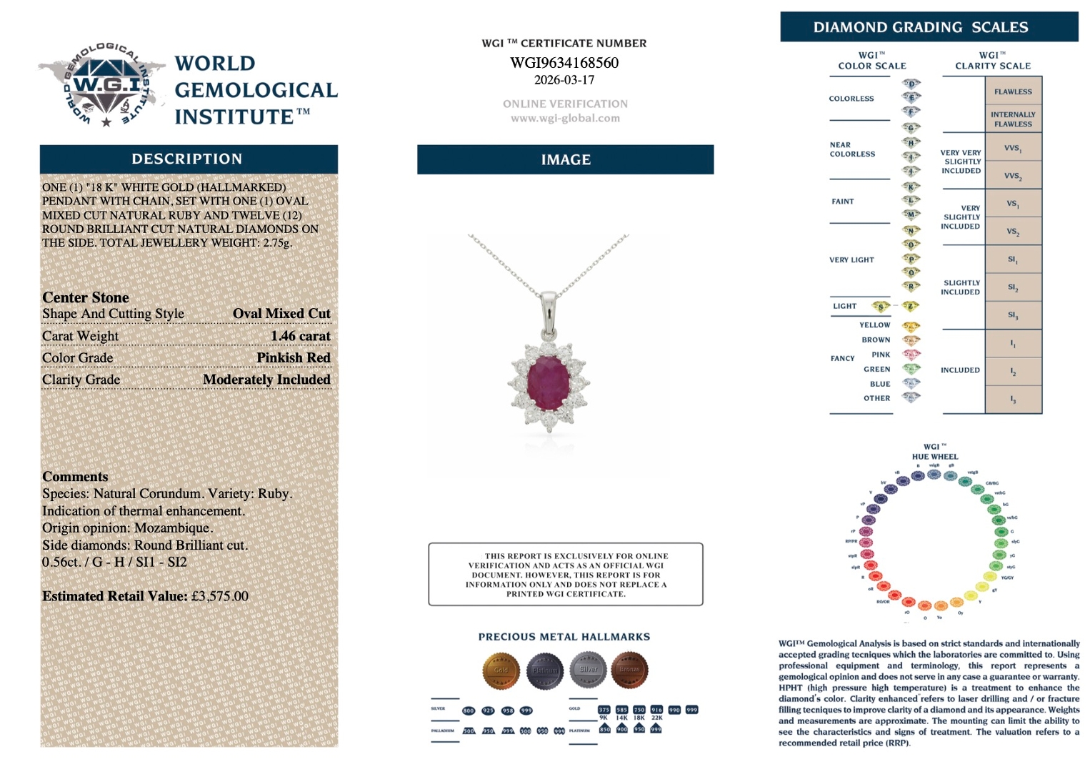 A brand-new, unused certified natural diamond and ruby cluster pendant, designed in a timeless oval form that showcases both colour and brilliance in perfect balance. At its centre sits a 1.46 ct oval mixed-cut ruby, displaying an attractive pinkish-red hue with lively depth, while a surrounding halo of twelve brilliant-cut natural diamonds provides a bright and refined contrast that enhances the vibrancy of the centre stone.