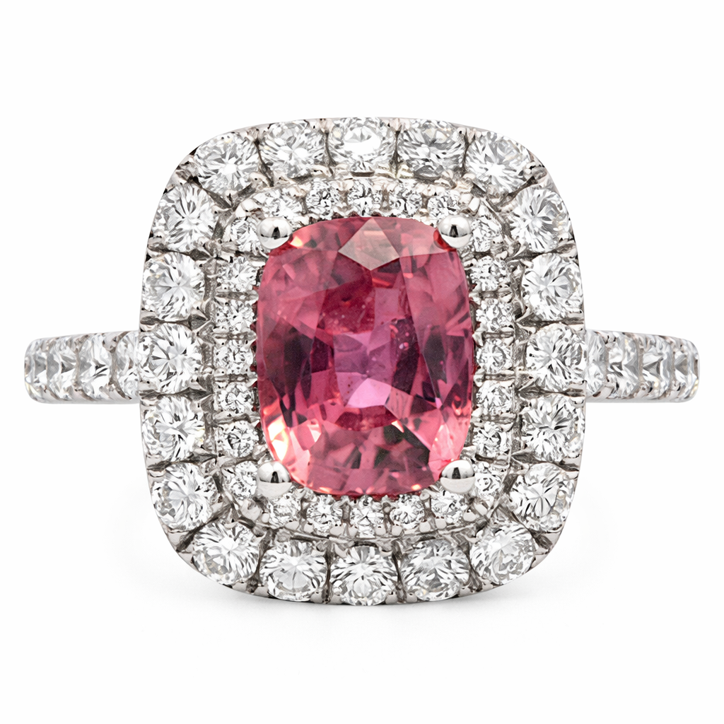 The surrounding diamonds total 1.09 ct, carefully arranged to maximise brilliance and to frame the centre stone with precision and balance. The double halo formation not only amplifies the ring's overall presence but also delivers a luxurious, high-impact aesthetic, with the platinum setting offering both durability and a naturally bright finish that complements the stones beautifully.