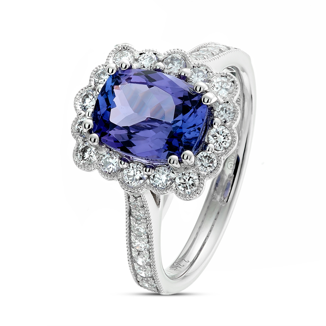 A brand-new, unused certified natural diamond and tanzanite cluster ring that radiates captivating beauty and refined craftsmanship. At its centre rests a stunning 2.24-carat cushion mixed-cut tanzanite, displaying a mesmerising violetish-blue hue that shifts elegantly with the light. Surrounding this exceptional gemstone is a flower-shaped halo of brilliant-cut natural diamonds that delicately continue along the shoulders, creating a dazzling display of brilliance and fire. With a total diamond weight of 0.62 carats, graded F–G in colour and VS2–SI1 in clarity, the diamonds bring exceptional sparkle and purity that perfectly complement the tanzanite’s rich, exotic tone.