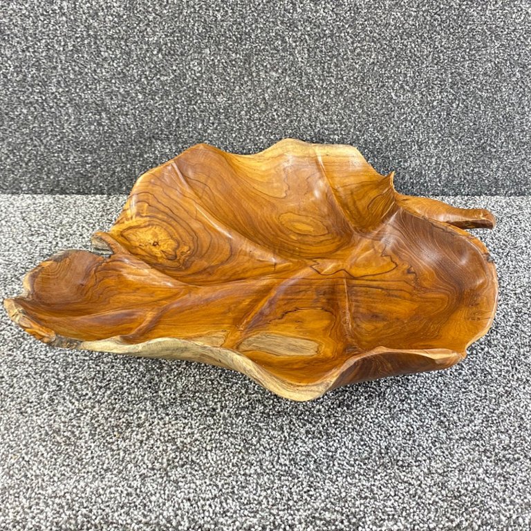 A Teak Root Wooden Leaf Design Bowl. Crafted from natural teak root wood, this bowl showcases the intricate beauty of nature in a unique leaf design.