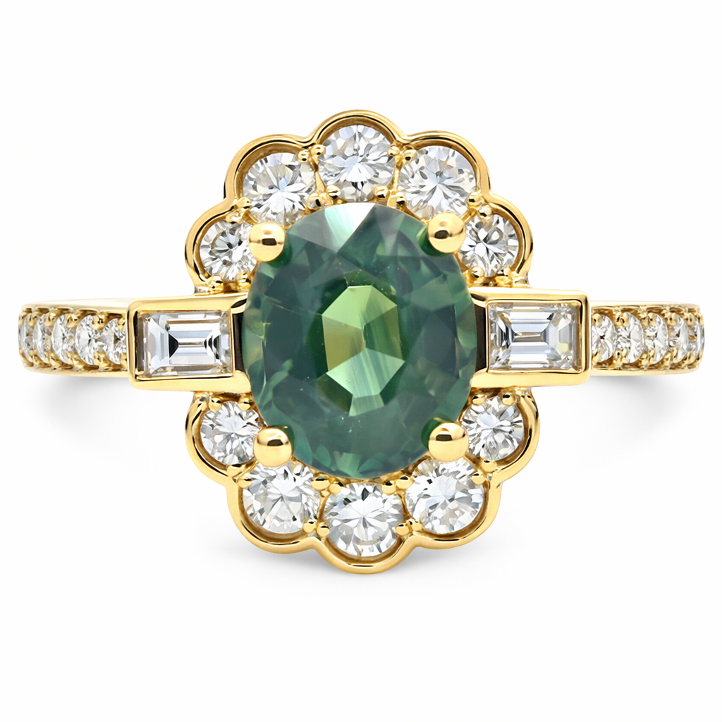 A brand-new, unused, certified natural diamond & teal sapphire flower-shaped cluster ring, with one oval-cut teal sapphire gemstone at the centre, two baguette-cut diamonds to the sides & a cluster of brilliant-cut diamonds in a halo setting & to the shoulders, set in 18ct yellow gold.