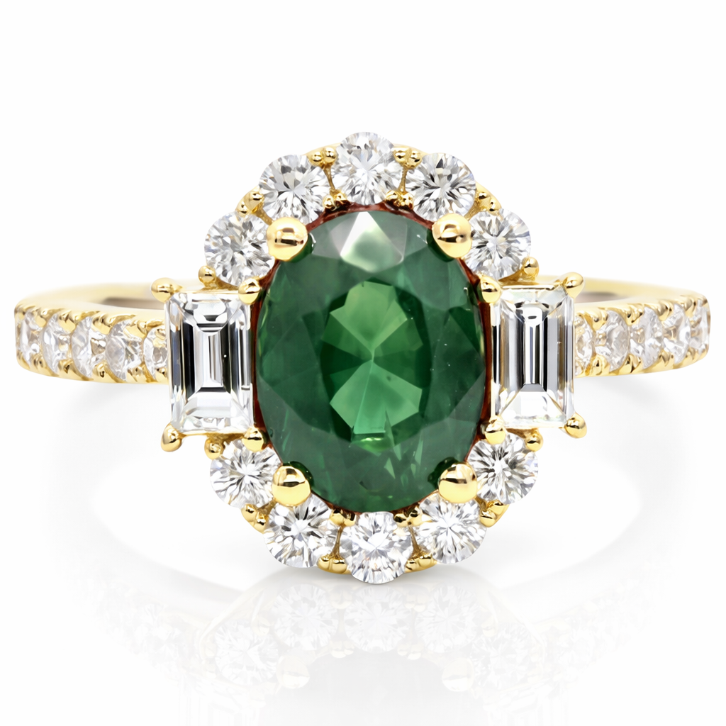 A brand-new, unused, certified natural diamond and teal sapphire oval-shaped cluster ring, crafted in 18ct yellow gold and designed to deliver strong colour contrast with classic structure. At the centre sits an oval-cut teal sapphire weighing 1.61 carats, selected for its distinctive blue-green tone and excellent presence. The centre stone is framed by two baguette-cut natural diamonds on the sides, adding clean lines and architectural balance, while a surrounding halo of brilliant-cut diamonds extends onto the shoulders to complete the cluster design. With a total diamond weight of 0.71 carats, the diamonds provide notable brilliance and definition, enhancing the sapphire without competing for attention.