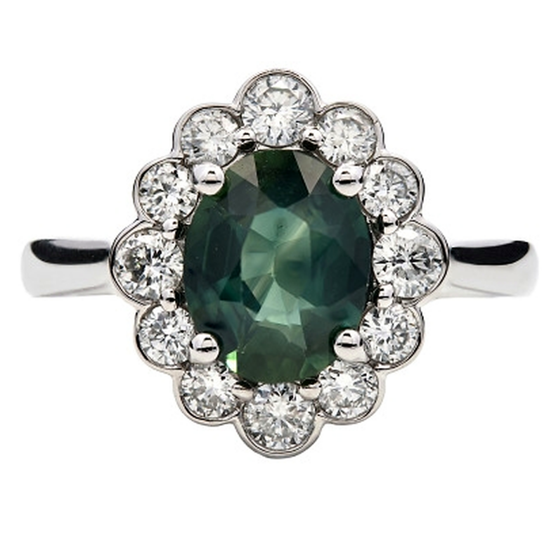 - > Natural Teal Sapphire 1.63ct & Diamond 0.57ct Flower Shaped Cluster Ring