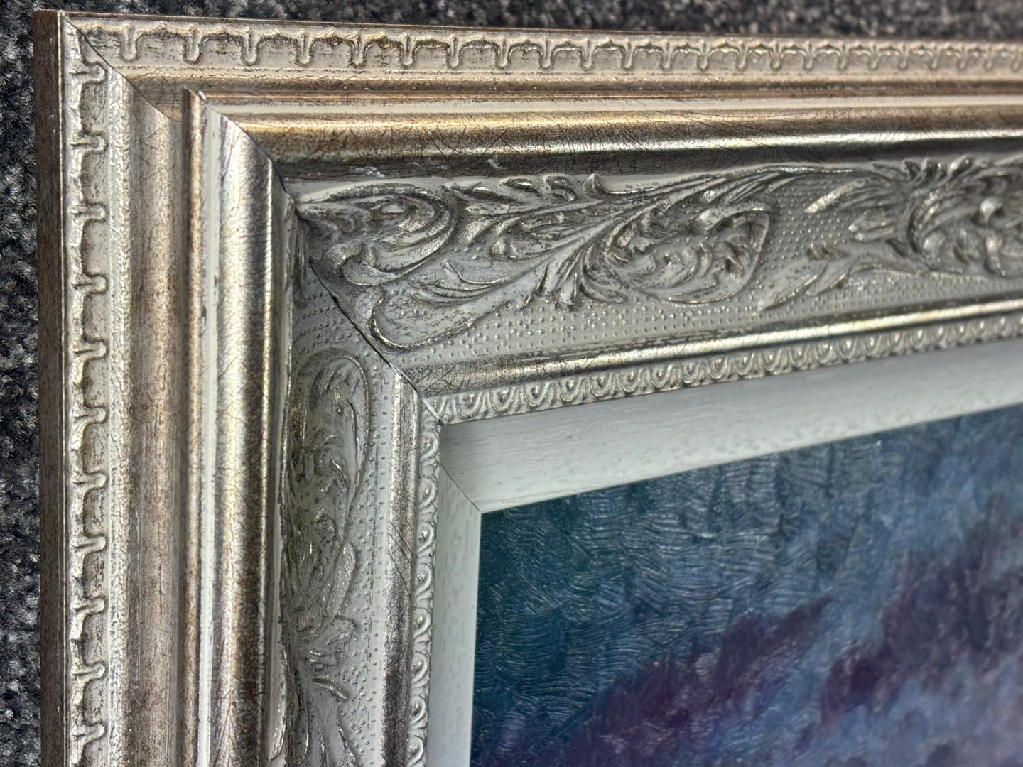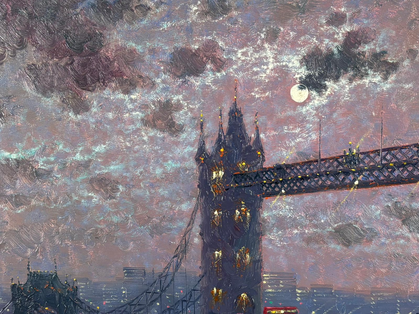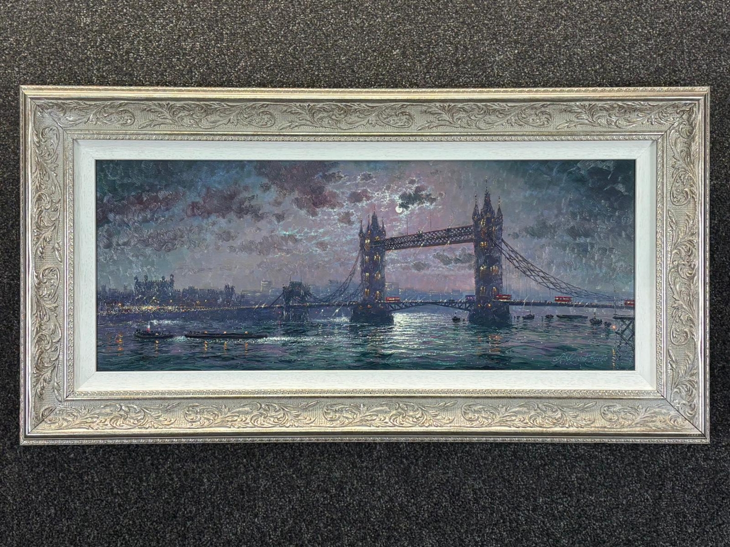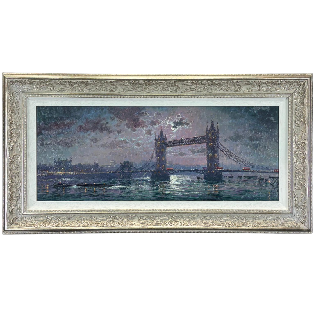 A striking framed original oil painting by Andrew Grant Kurtis titled ‘Tower Bridge By Moonlight’, depicting one of London’s most recognisable landmarks under an atmospheric evening sky. Kurtis, a London-born artist trained at the City and Guilds of London Institute, is celebrated for his mastery of light and his distinctive approach to atmospheric perspective, both of which are beautifully demonstrated in this piece.
