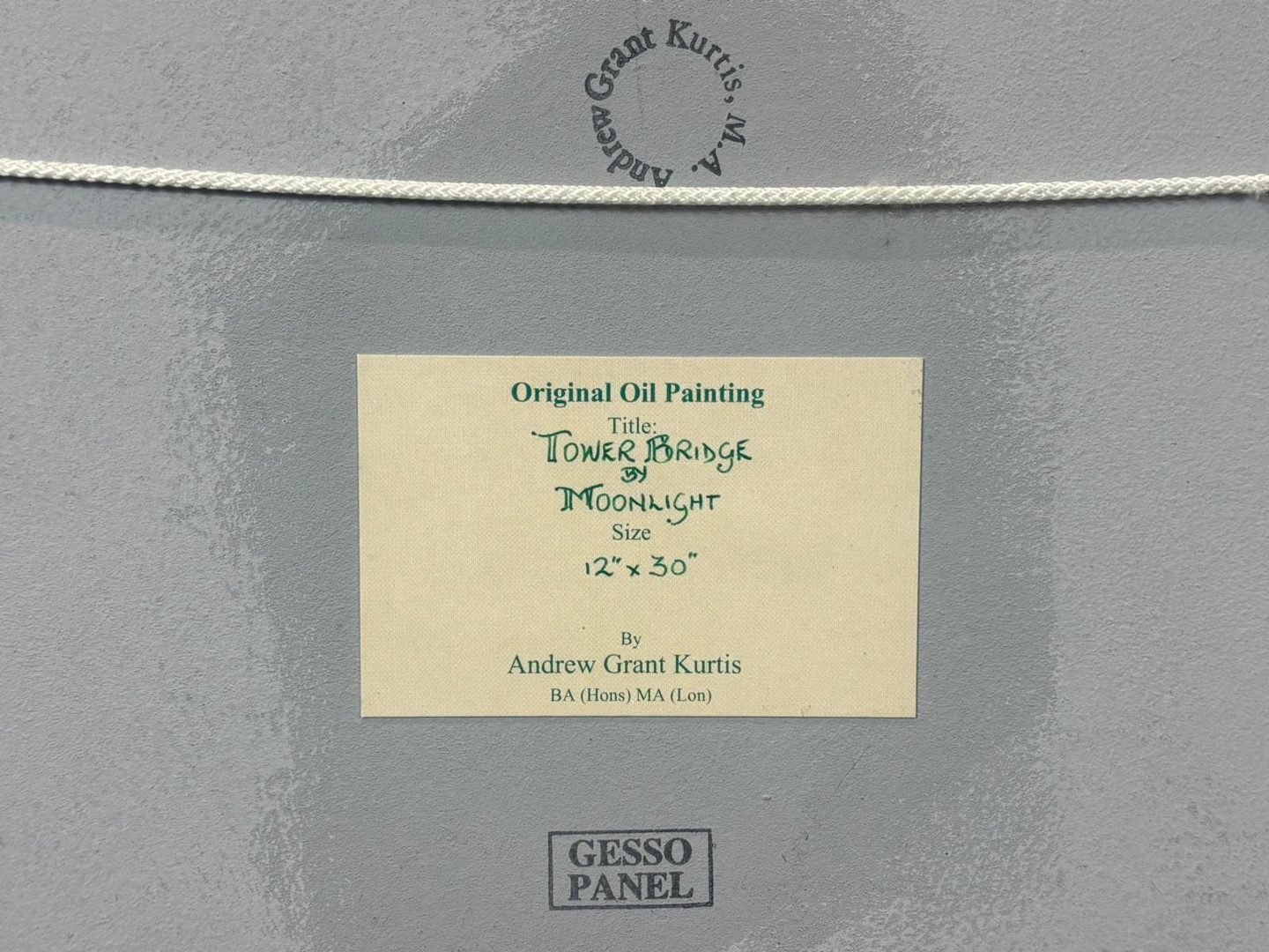 A framed original oil painting by Andrew Grant Kurtis titled 'Tower Bridge By Moonlight'. Approx 12" height, 20" width.