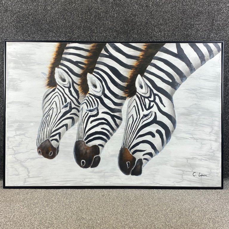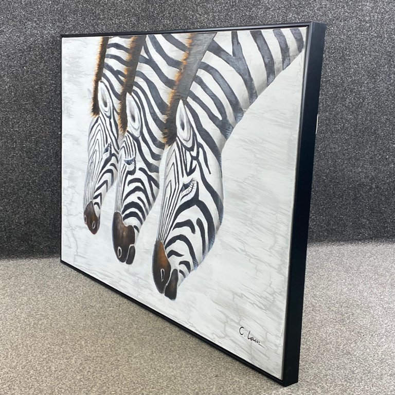 The contrast between the black and gold frame enhances the painting's visual impact, adding a touch of elegance and refinement to any space. Whether displayed in a living room, office, or gallery, "Three Zebras" serves as a captivating focal point, sparking conversation and inspiring admiration for the beauty of the natural world.