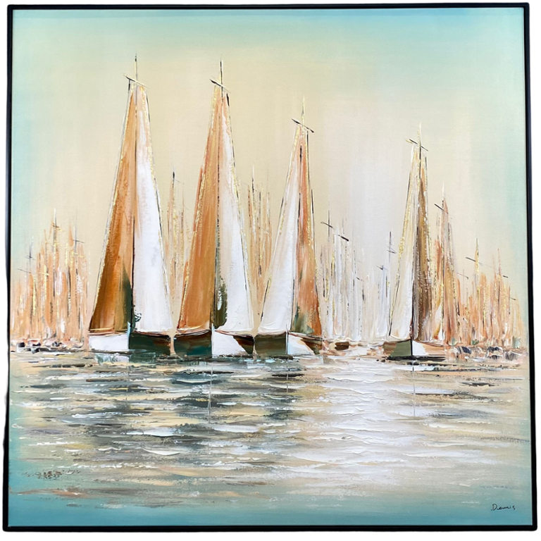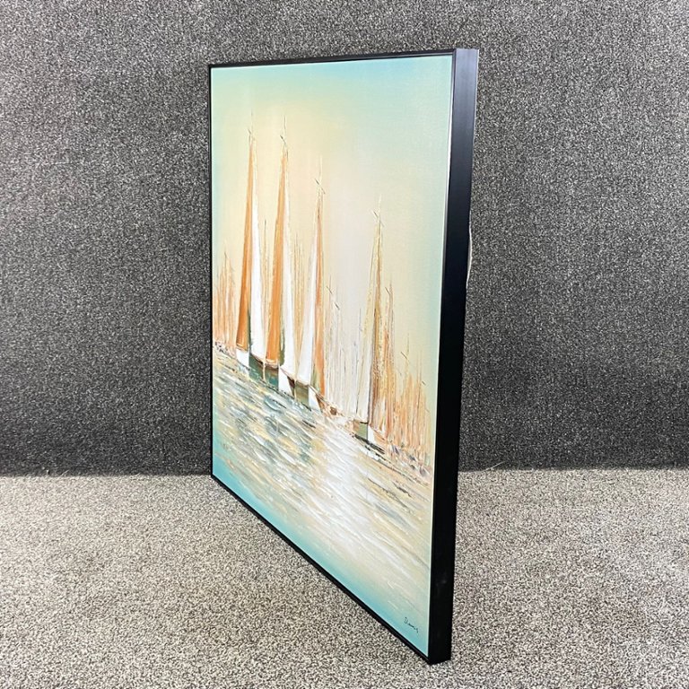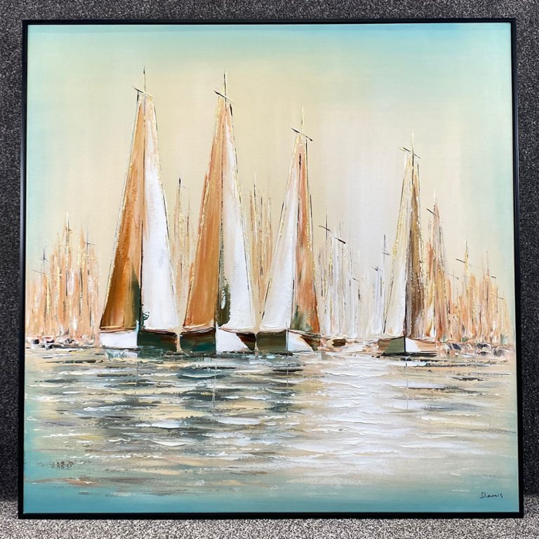Experience the allure of the open seas with this captivating oil painting by the artist Dennis, titled "Yachts." Encased in a sleek black frame, this mesmerizing artwork measures 40 inches in height and width, commanding attention and instilling a sense of sophistication in any space.