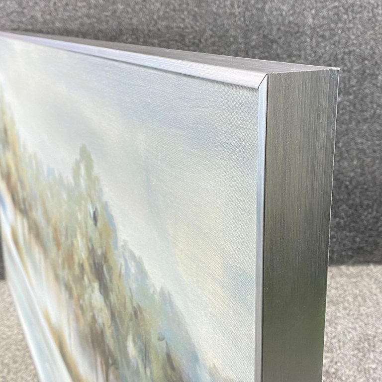Step into the serene beauty of nature with "Morning Forest," an enchanting oil painting by the artist Harley. Encased in a sophisticated silver frame, this captivating artwork measures 30 inches in height and an expansive 60 inches in width, offering a panoramic view of a tranquil woodland scene.