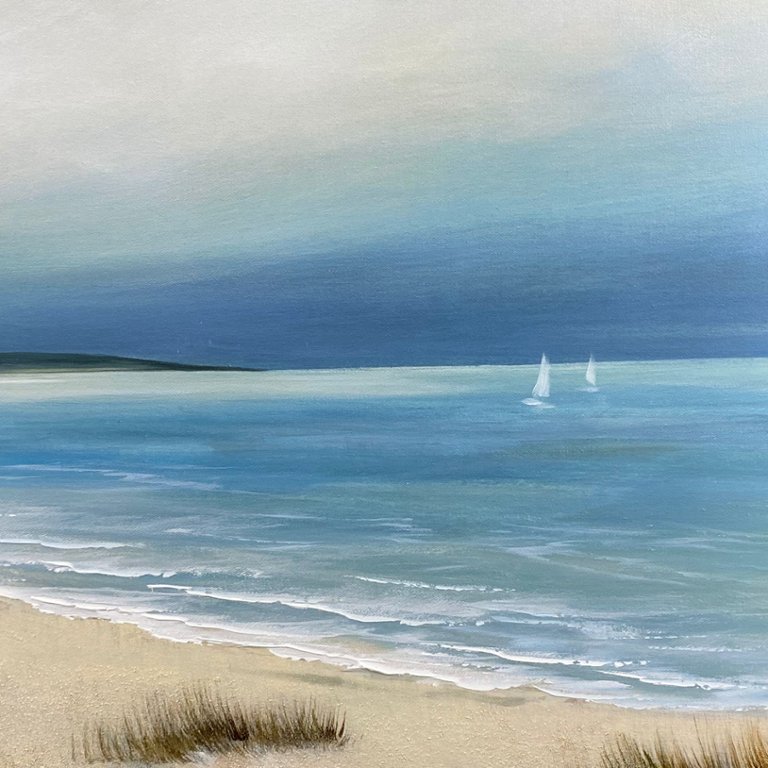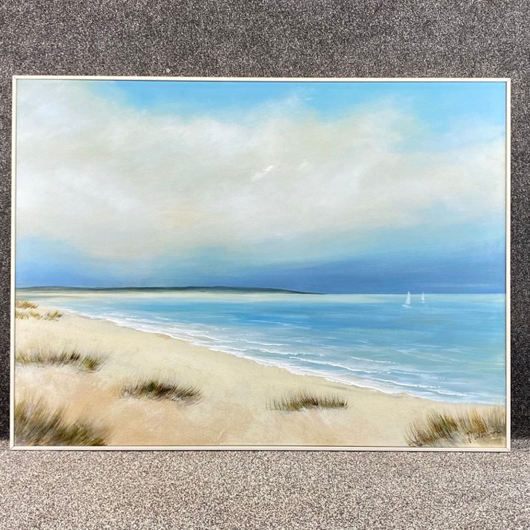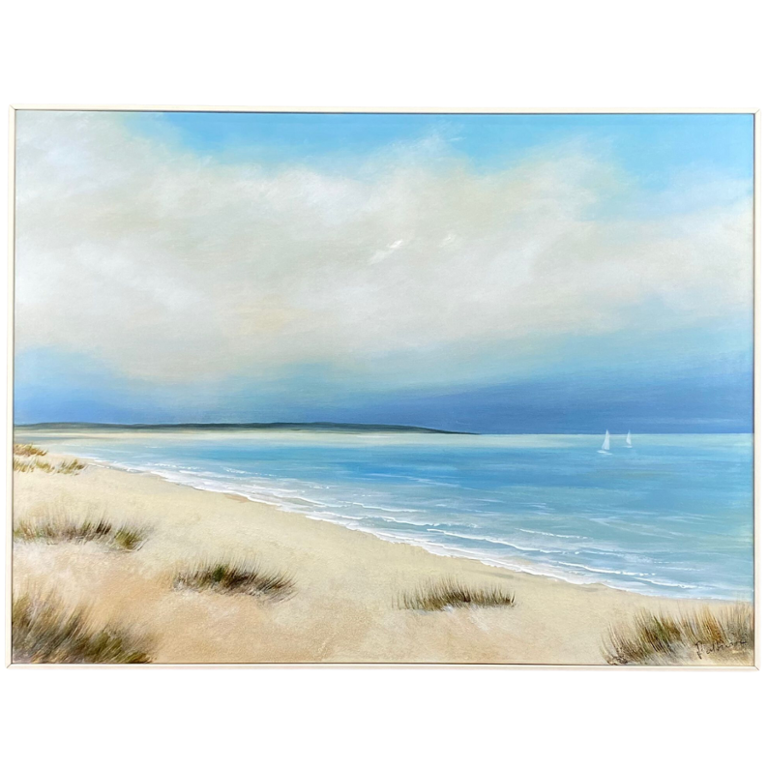 Patterson's masterful brushstrokes capture the essence of a tranquil seaside scene, where gentle waves caress the sandy shore under a vast expanse of sky. The artist's keen eye for detail and use of vibrant colours bring the coastal landscape to life, evoking a sense of serenity and tranquillity.