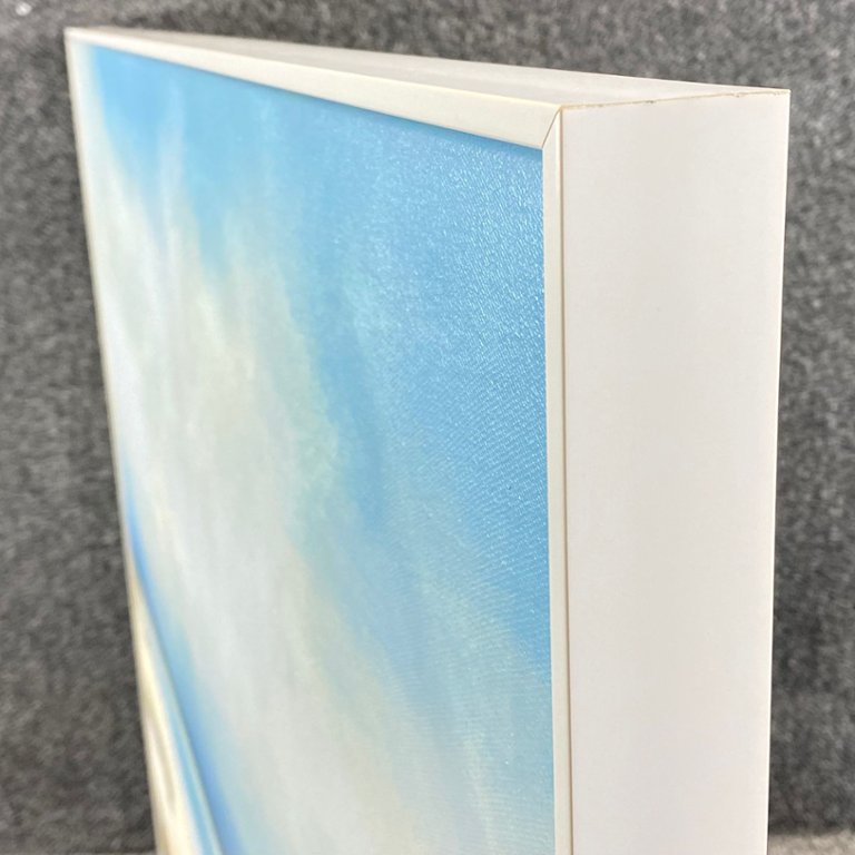 Experience the serene allure of coastal beauty with "Seaside," an exquisite oil painting by the artist Patterson. Encased in a pristine white frame, this captivating artwork measures 36 inches in height and 48 inches in width, making it a stunning centrepiece for any space.